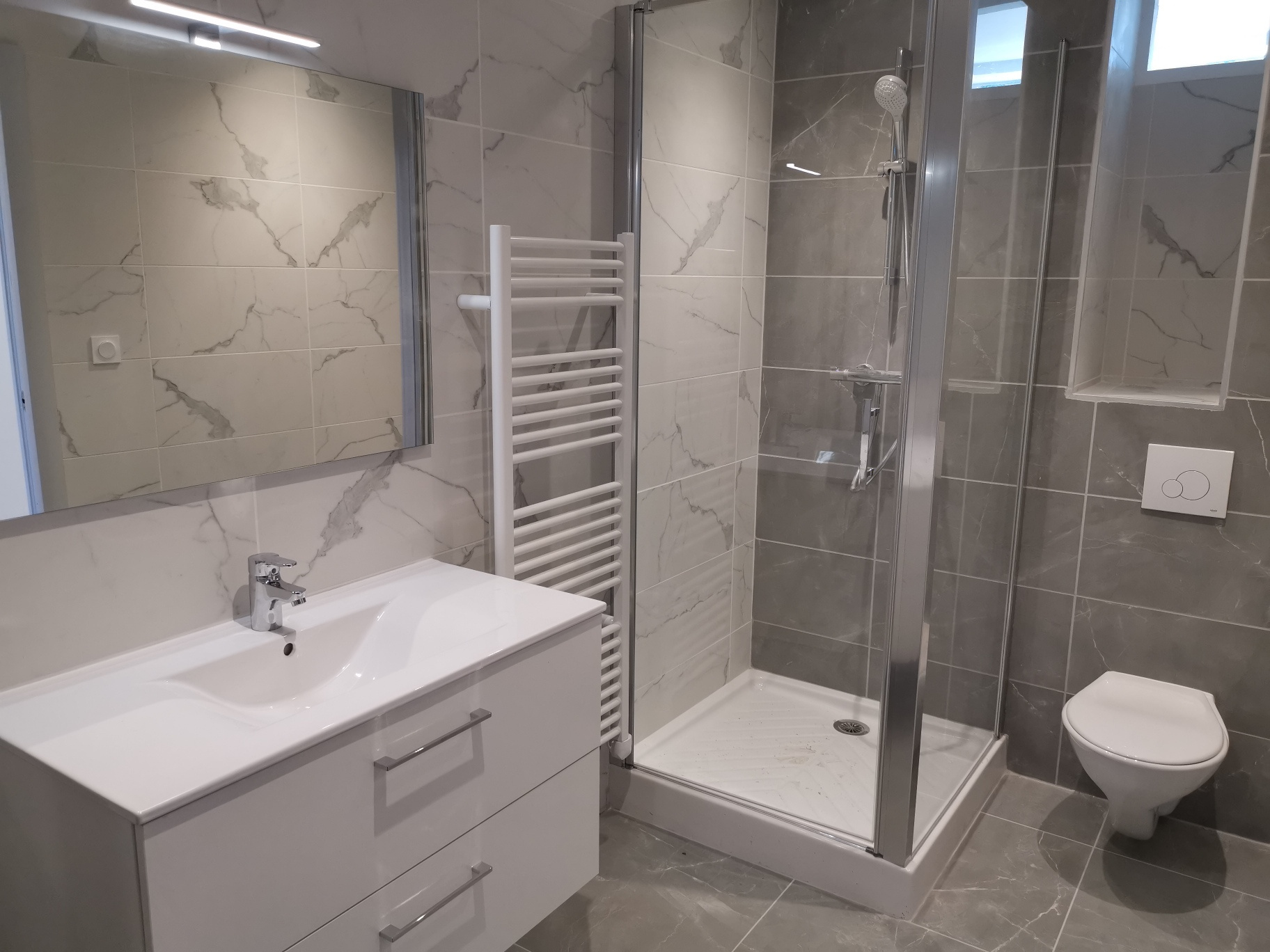 - une entrée avec placard, un séjour, une kitchenette équipée (plaque + hotte), une chambre, une salle de bains, un wc.