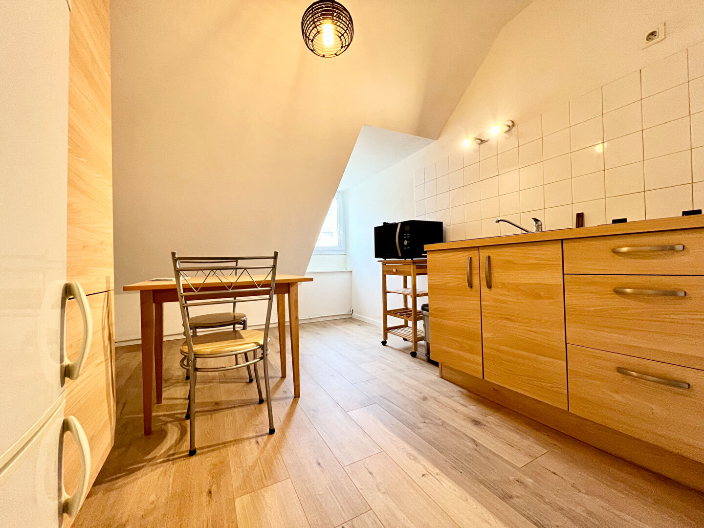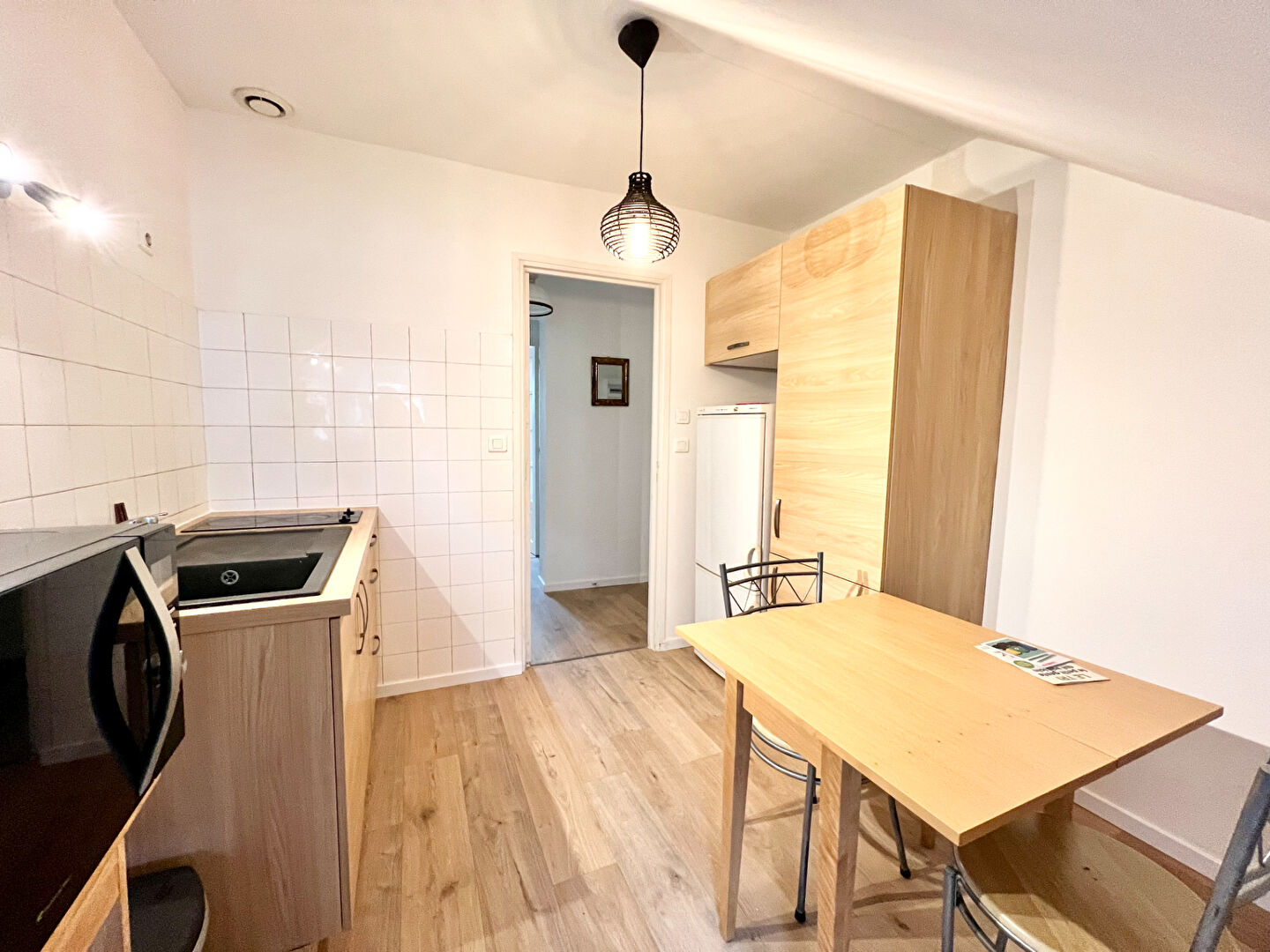 RODEZ-HYPERCENTRE : T2 mansardé meublé comprenant un hall d'entrée, un salon, une cuisine aménagée (meubles hauts et bas, domino de cuisson vitrocéramique, micro-ondes, frigidaire congélateur), une chambre avec un placard, une salle de bain aménagée avec ...