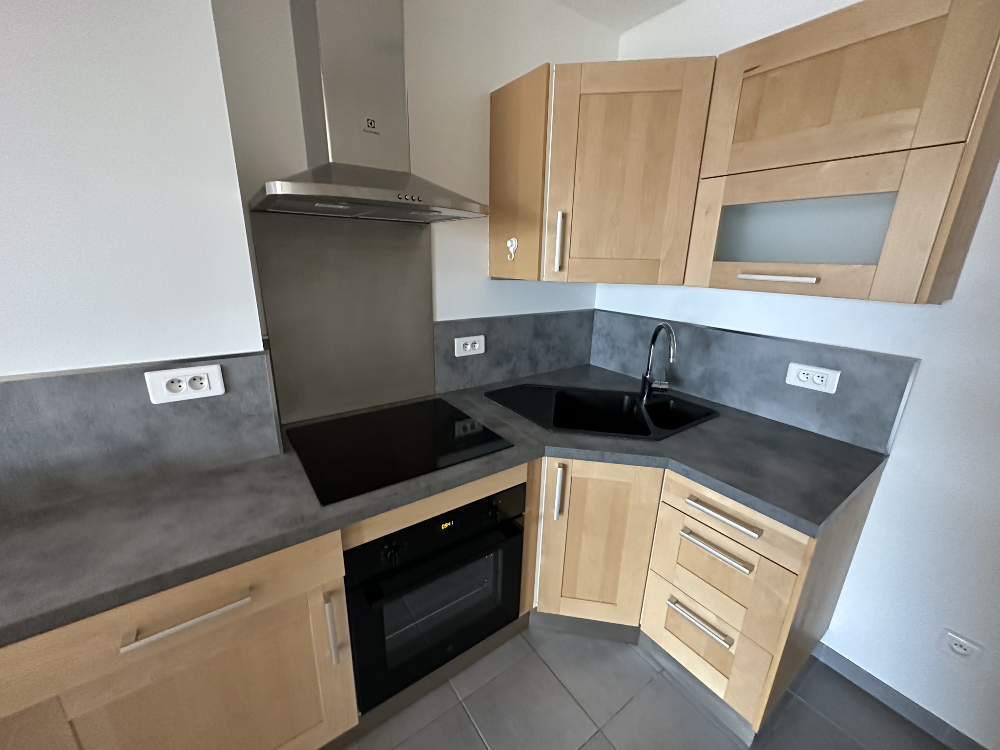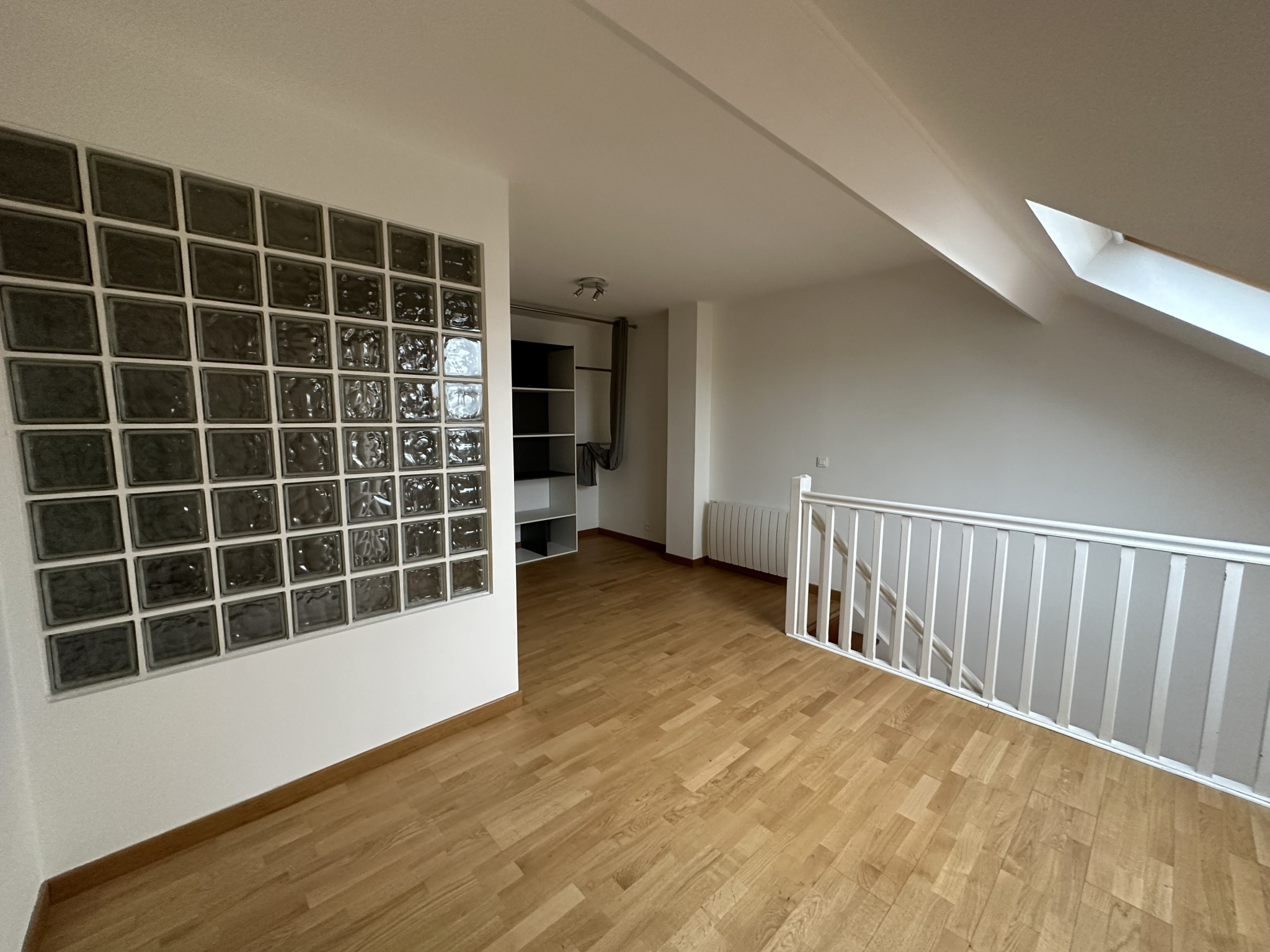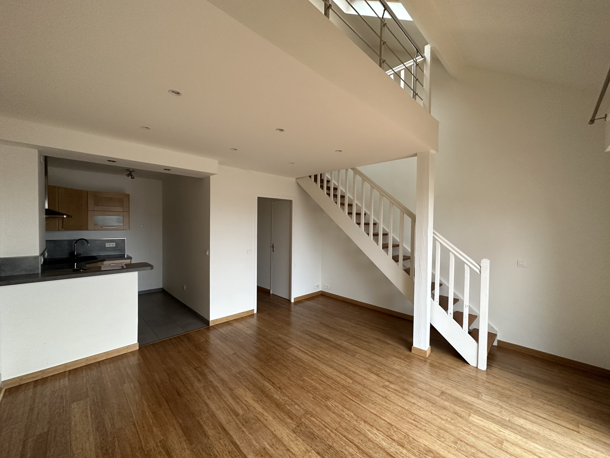 Entrée, Séjour, Cuisine ouverte équipée, wc séparés, Chambre et salle de bains à l'étage. Box. Libre le 3 février 2026