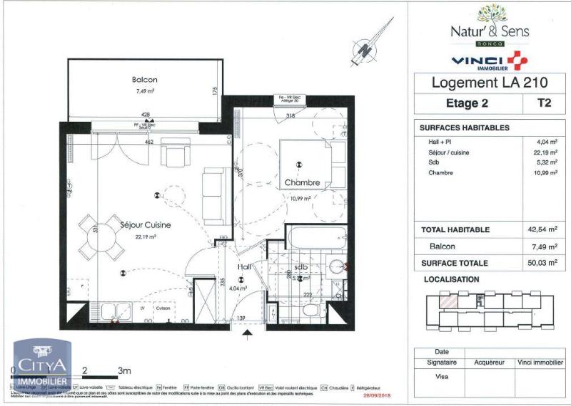 L'appartement T2 de 42,54 m² se compose d'un séjour lumineux, d'une cuisine équipée et aménagée, d'une chambre spacieuse, d'une salle de bai...