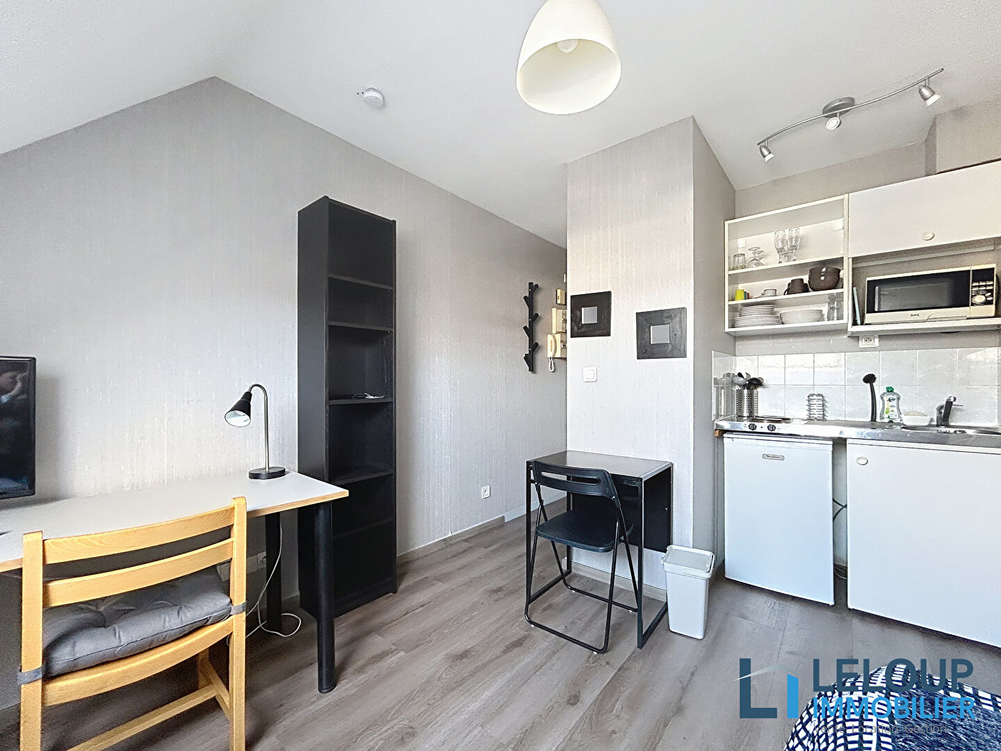 Grand studio composé d'une entrée, une cuisine indépendante, une pièce principale, un espace bureau en mezzanine - mobiliers et vaisselles très bon état