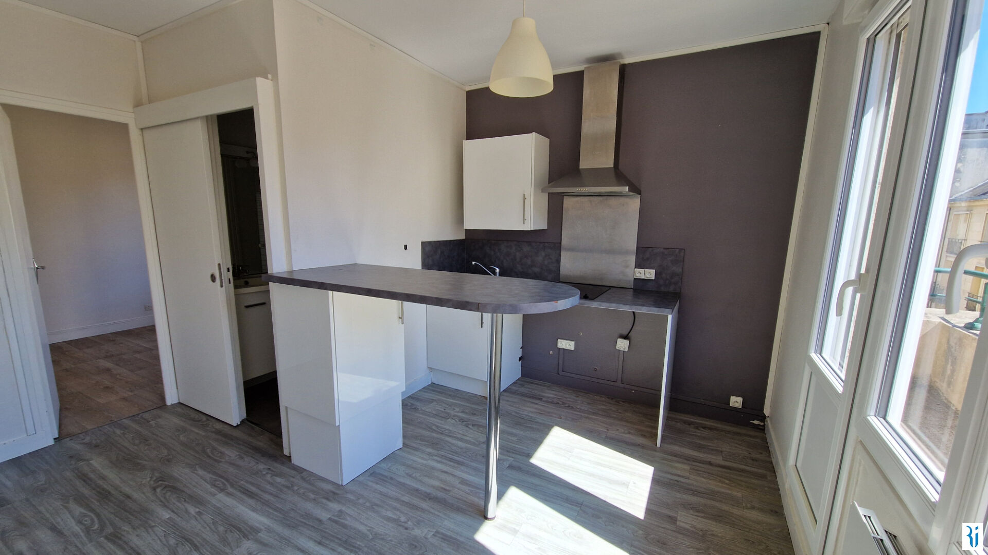 Un appartement 2 pièces en parfait état, NON MEUBLÉ, comprenant : une entrée, un séjour avec cheminée décorative, espace cuisine aménagée et équipée (meubles de rangement hauts et bas, plaque de cuisson, hotte, ré...