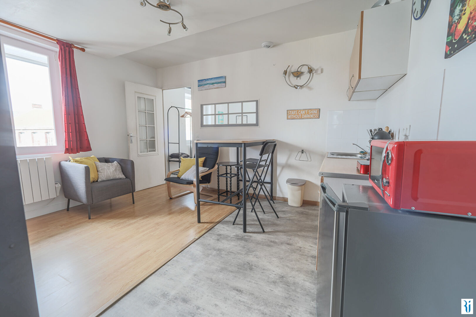 ROUEN RIVE DROITE - QUARTIER VIEUX MARCHE - Un studio meublé avec goût de 32,45 m2 au coeur de Rouen, comprenant une pièce de vie avec lit double, bureau, penderie, canapé, un coin cuisine équipée d'une table avec chaises, le nécessaire pour se restaurer,...