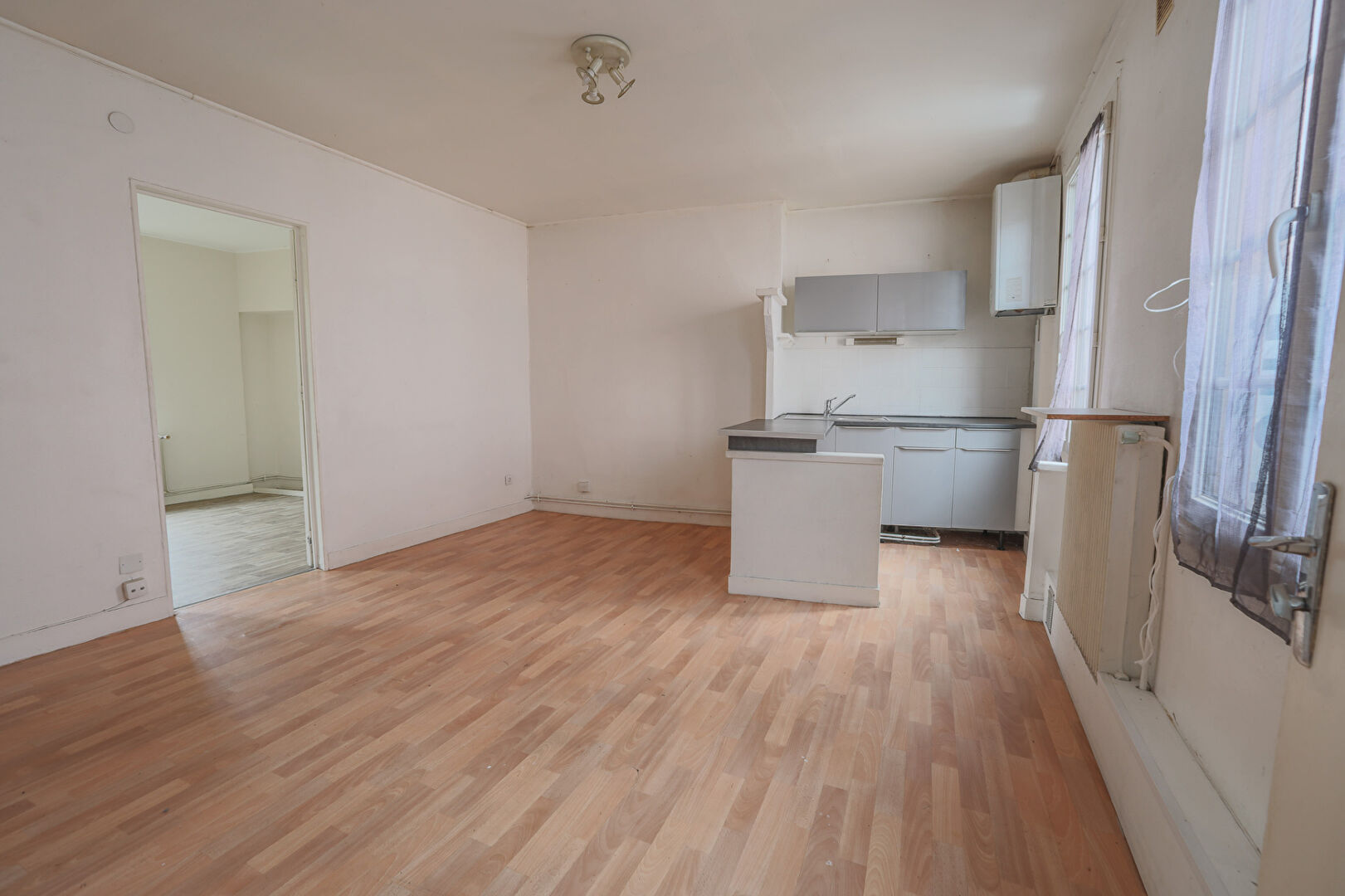 Entrée, séjour avec cuisine ouverte, chambre,