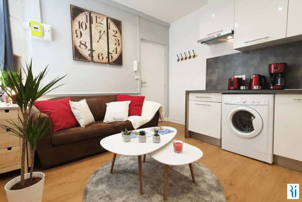 ROUEN RIVE DROITE - QUARTIER VIEUX MARCHE - Un studio meublé avec goût de 32,45 m2 au coeur de Rouen, comprenant une pièce de vie avec lit double, bureau, penderie, canapé, un coin cuisine équipée d'une table avec chaises, le nécessaire pour se restaurer,...