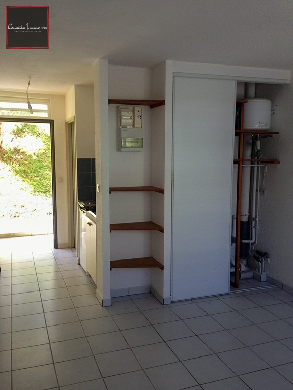Entrée avec kitchenette (semi-équipée), pièce principale avec placards, salle d'eau avec WC.
