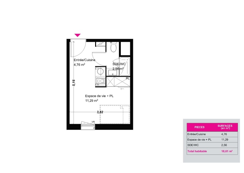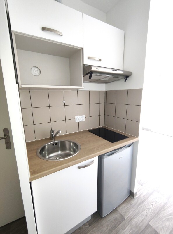 Disponible Début Février, proximité commerces et transports F1 avec pièce principale et kitchenette équipée. Chauffage individuel électrique.