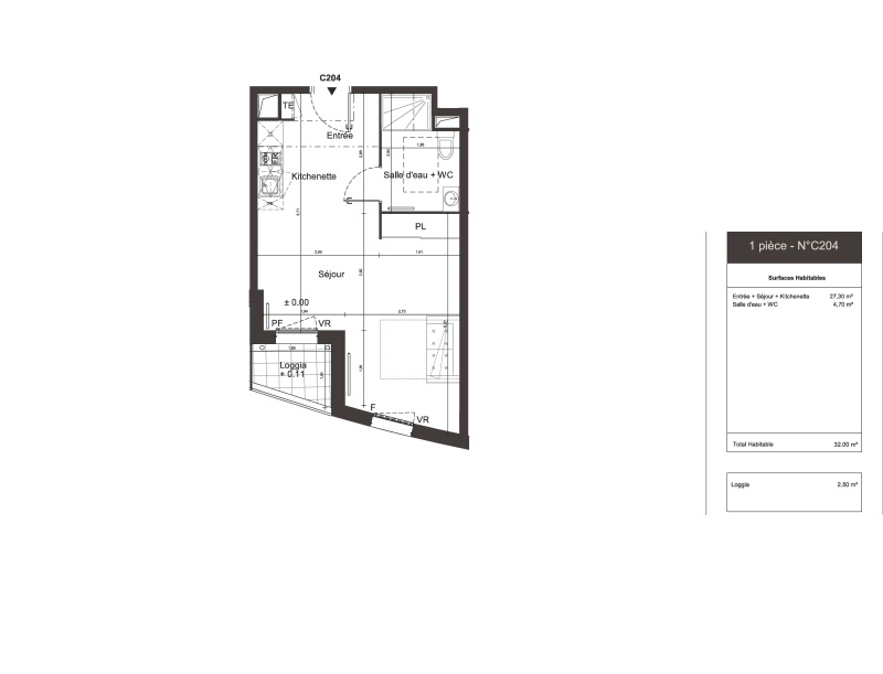 Studio de 25.1m2 comprenant entrée, pièce de vie avec cuisine us, salle d'eau avec wc. Libre