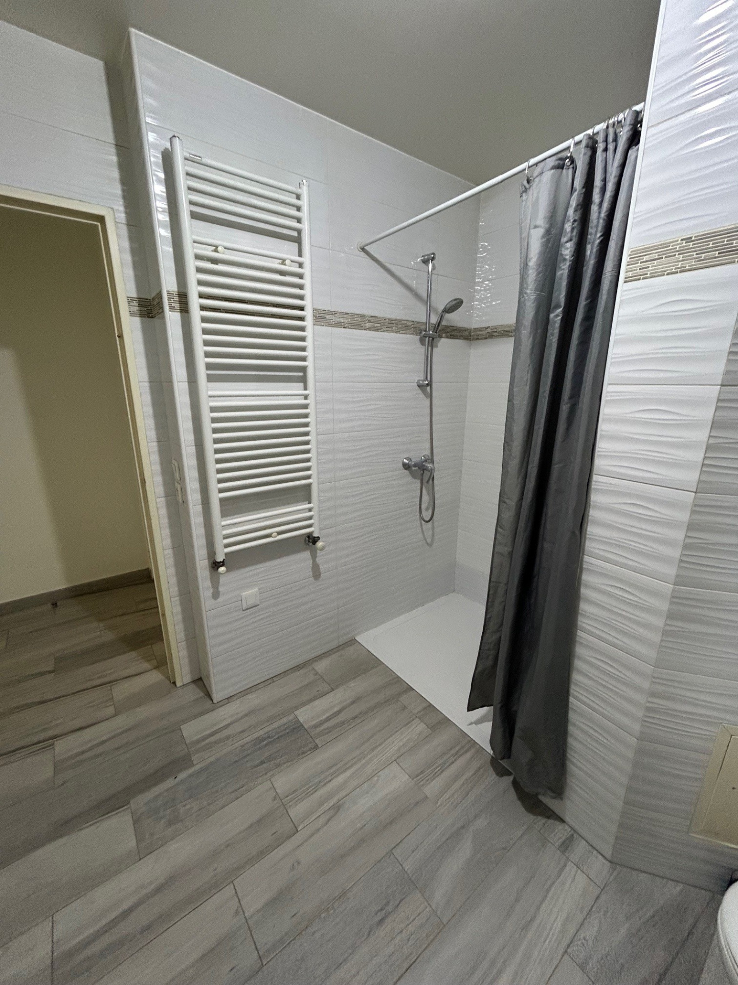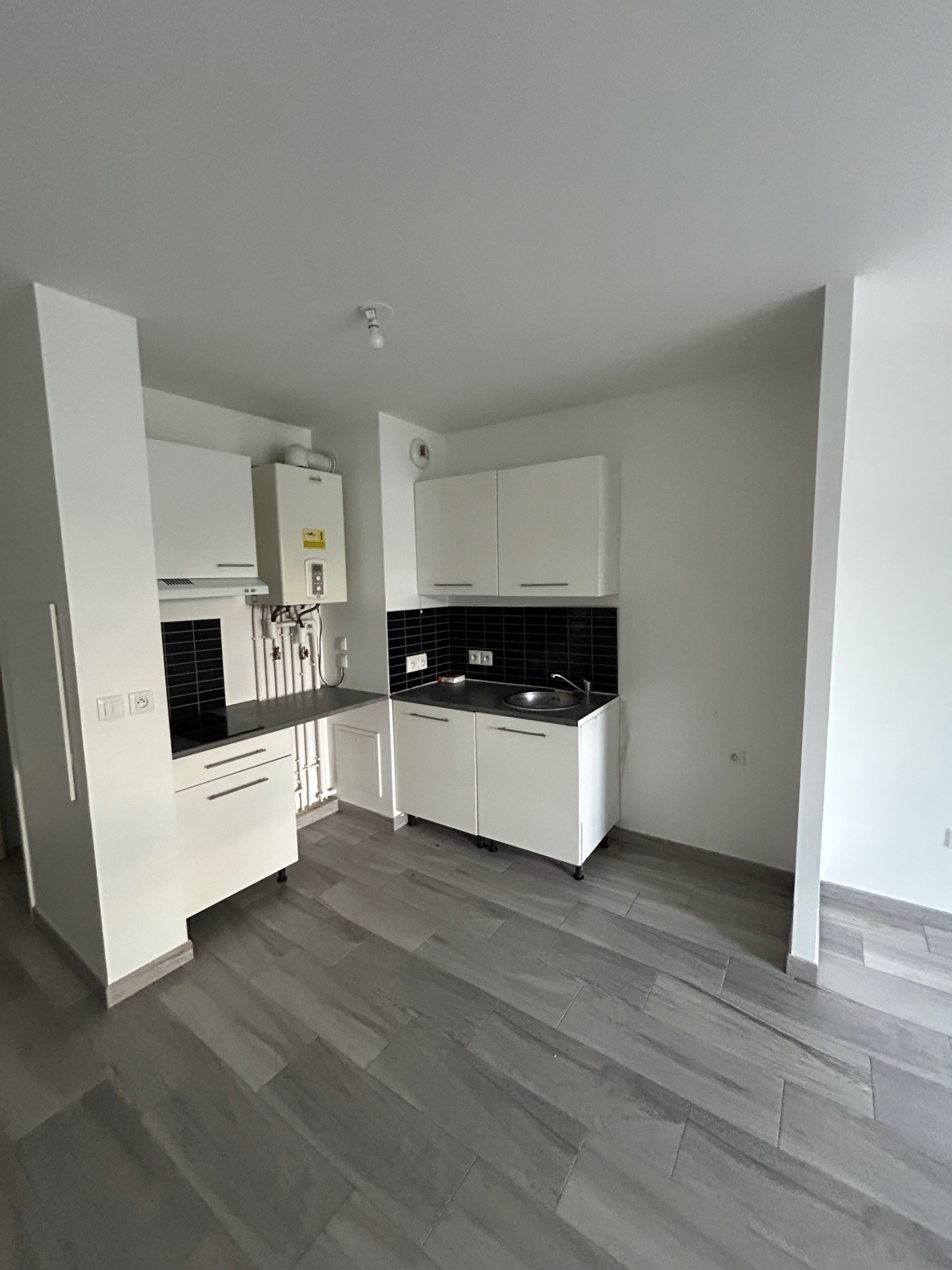 Un logement refait à neuf composé d'une entrée qui donne sur la cuisine, un séjour, une chambre, une salle de bain avec WC.