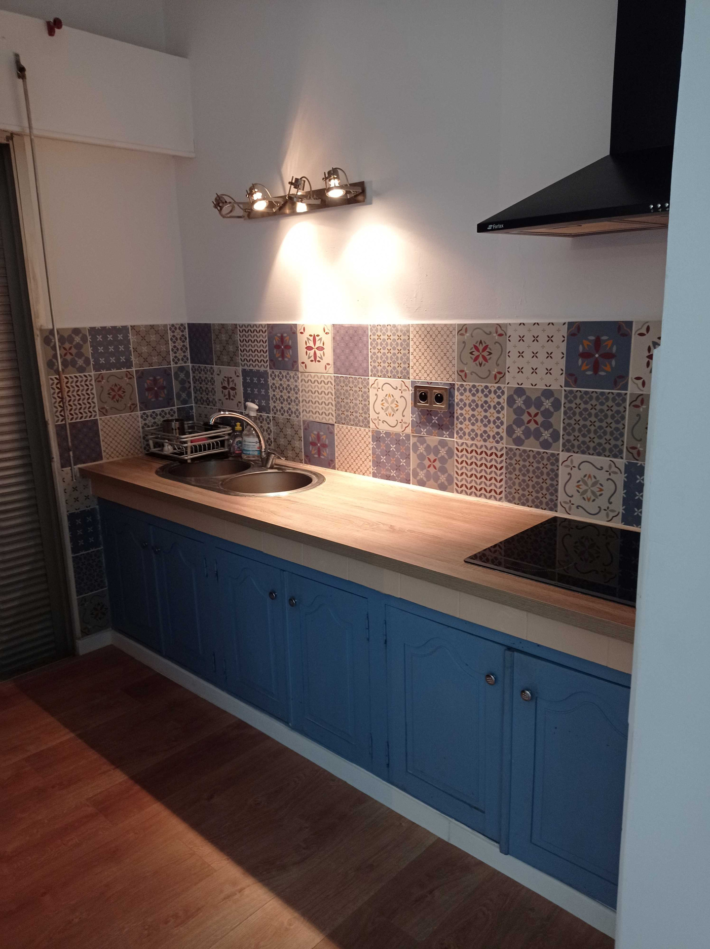 Vous entrez par ma petite cuisine fonctionnelle, suivie de ma salle d'eau avec wc, équipée d'un lave linge.