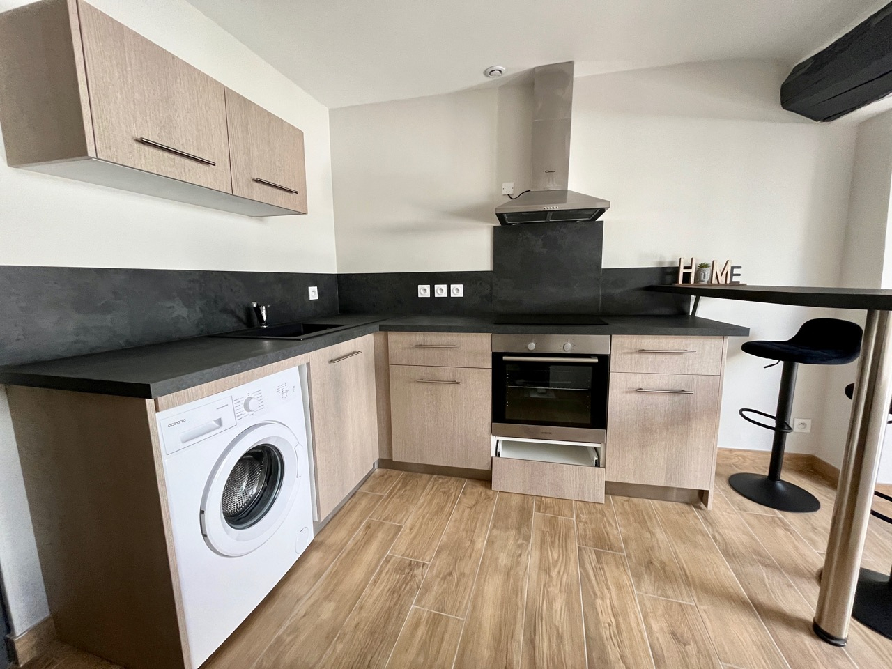 L'appartement comprend : une entrée, une cuisine équipée (plaque et hotte) avec coin repas, un salon séjour, une chambre, une s...