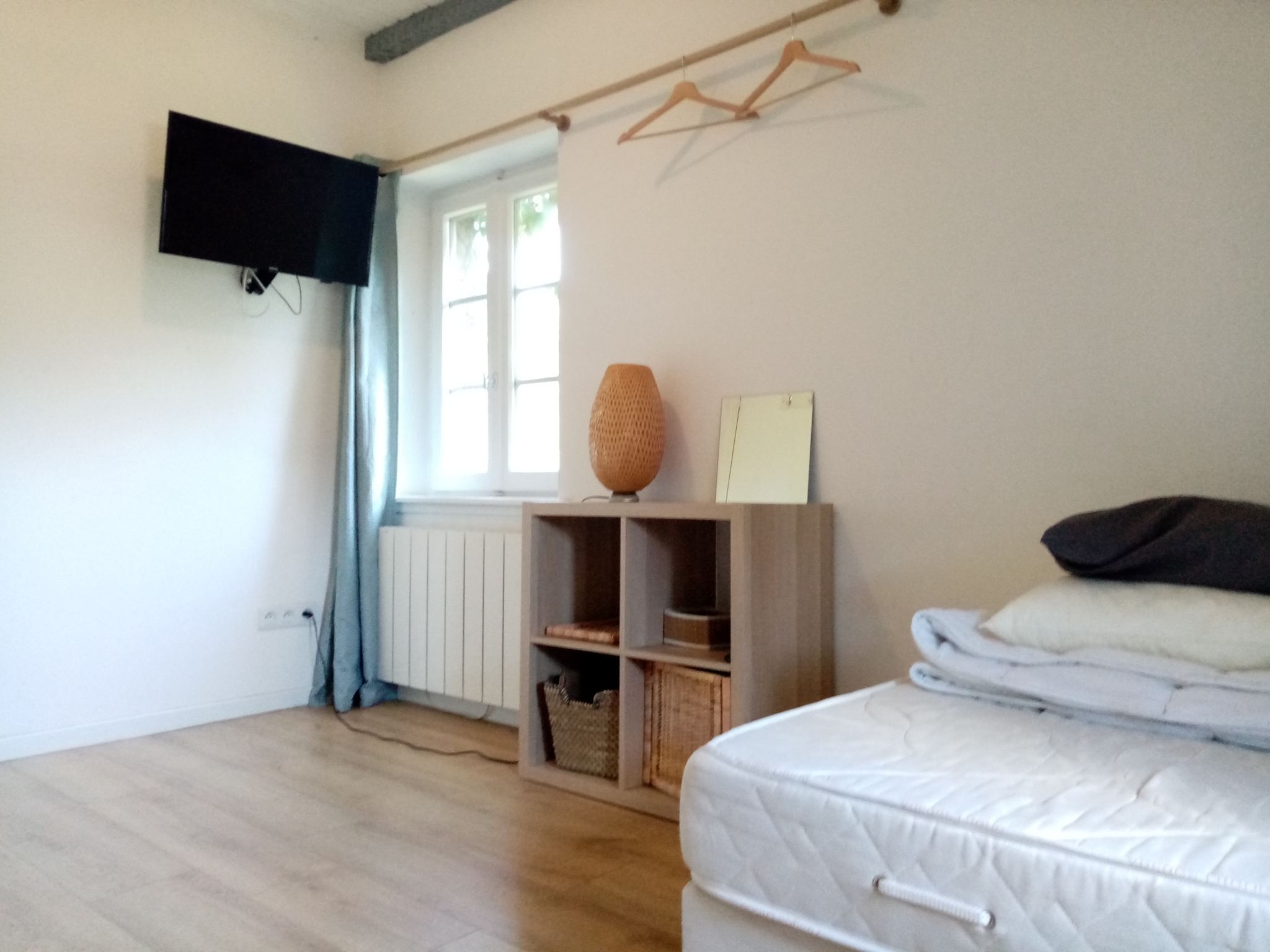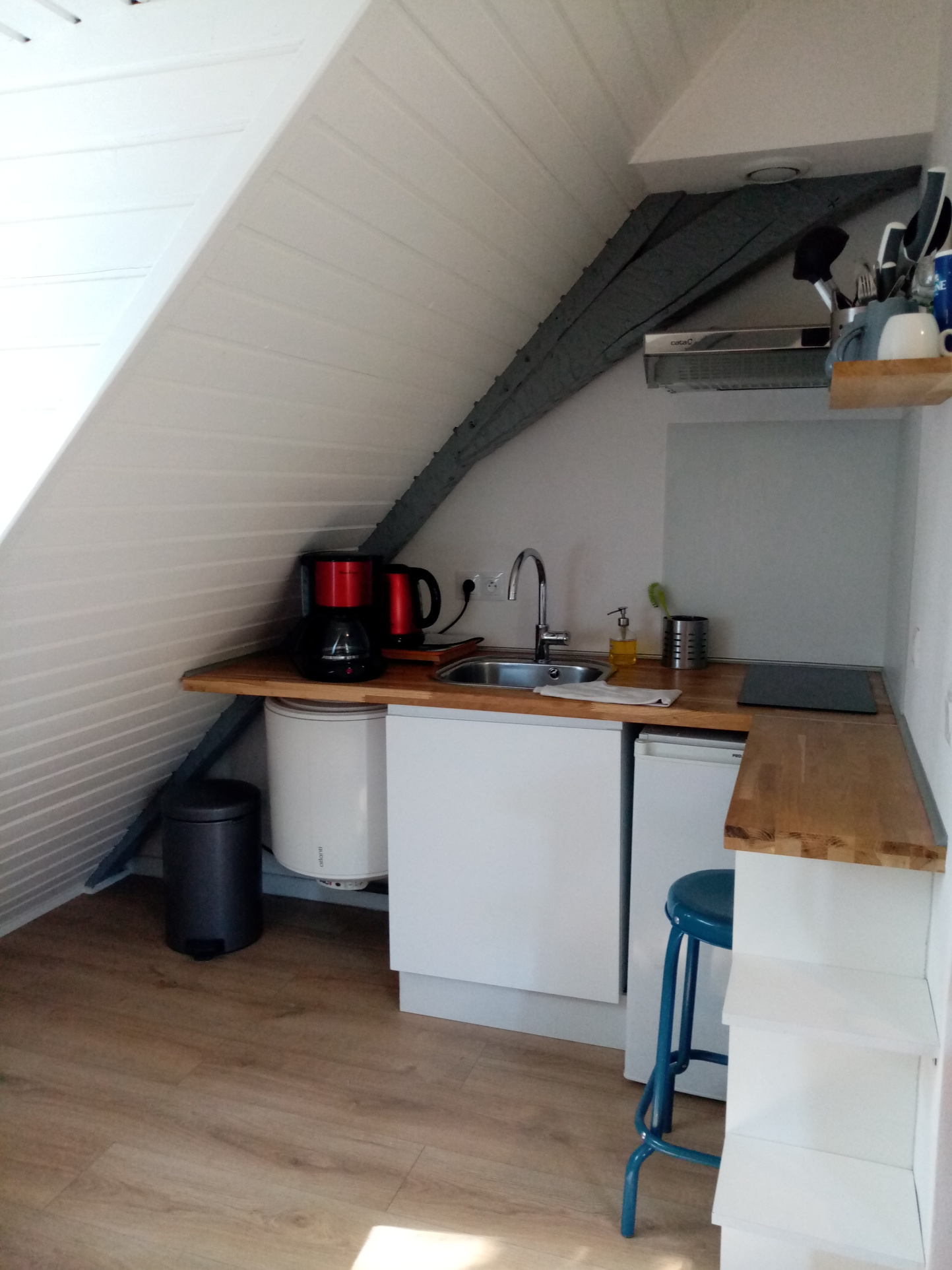 La chambre de bonne, située au 1er étage, est entièrement meublée et dispose d'une kitchenette équipée avec plaques de cuisson et réfrigérateur, ainsi que d'un lit, d'un bureau et d'une...