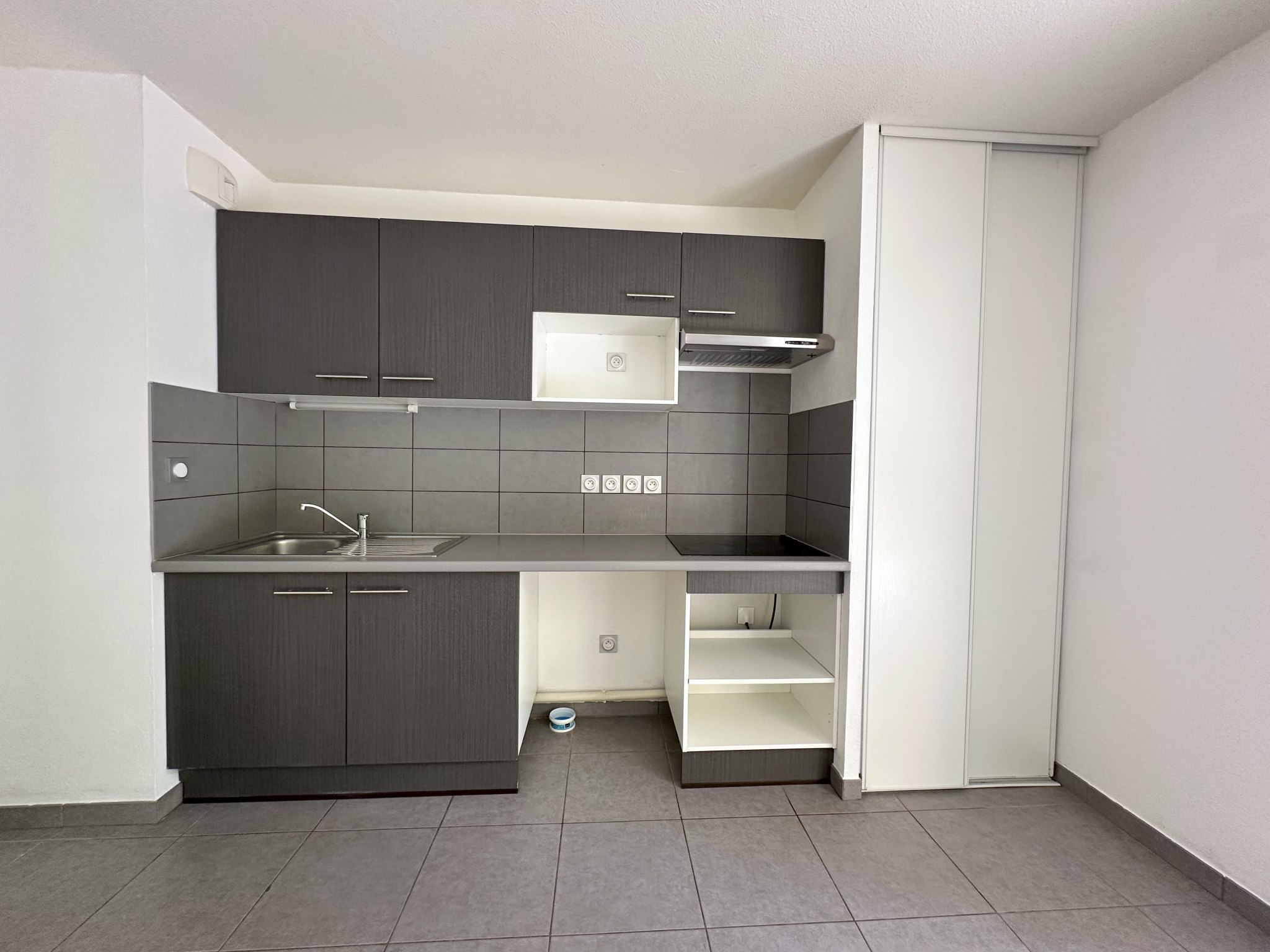 Une entrée, une pièce principale avec coin cuisine équipée et aménagée (Plaque de cuisson, four,...