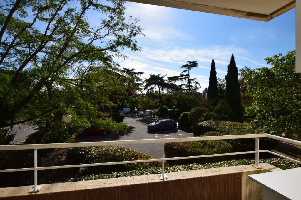 Tournefeuille côté Lardenne, rue Michel Montagne, bel appartement T2bis de 54 m2 à louer, entrée avec placard, séjour lumineux donnant sur balcon et parc de la résidence, une chambre avec placards équipés, un bureau, une cuisine aménagée avec plaque vitro, hot...