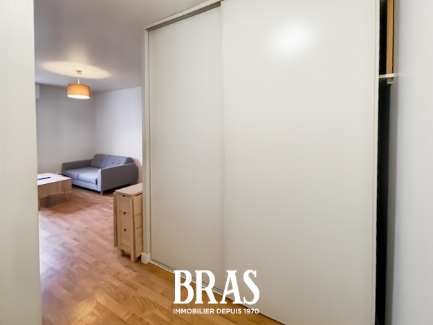 Appartement 2 pièces meublé situé au 1er étage avec ascenseur. Comprenant une entrée avec placard, une pièce principale avec coin cuisine aménagée et équipée (hotte, plaques, réfrigérateur), une chambre, salle d'eau...