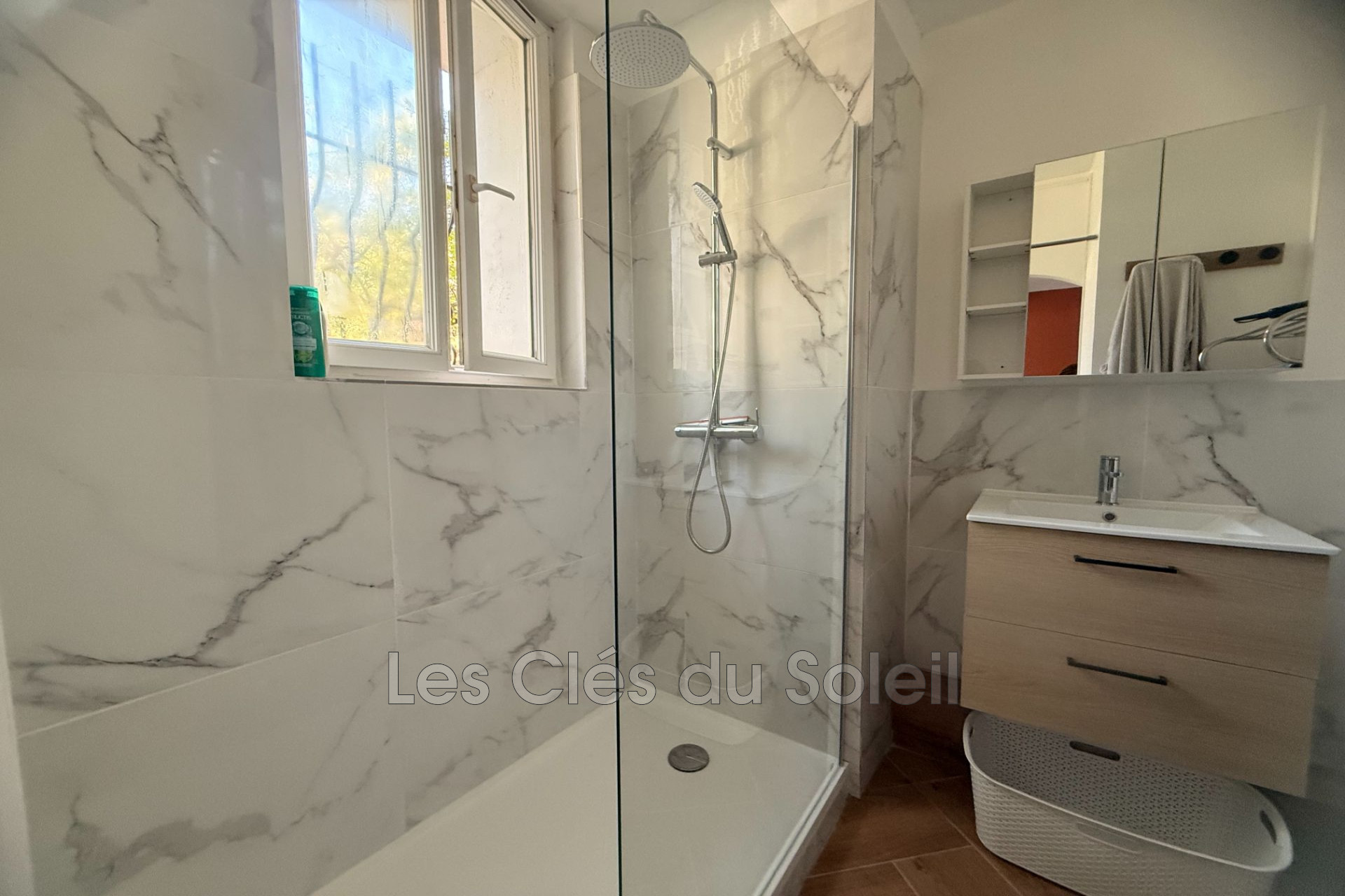 Une salle d'eau avec douche, meuble vasque et sèche...