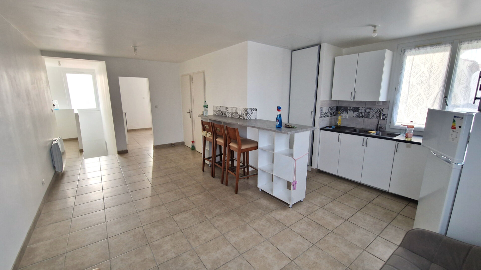 Comprenant : une entrée avec placard, deux chambres dont une avec placard, une salle d'eau (douche neuve), un débarras, wc indépendant, un séjour-salon et une cuisine équipée (four, plaque de cuisson...