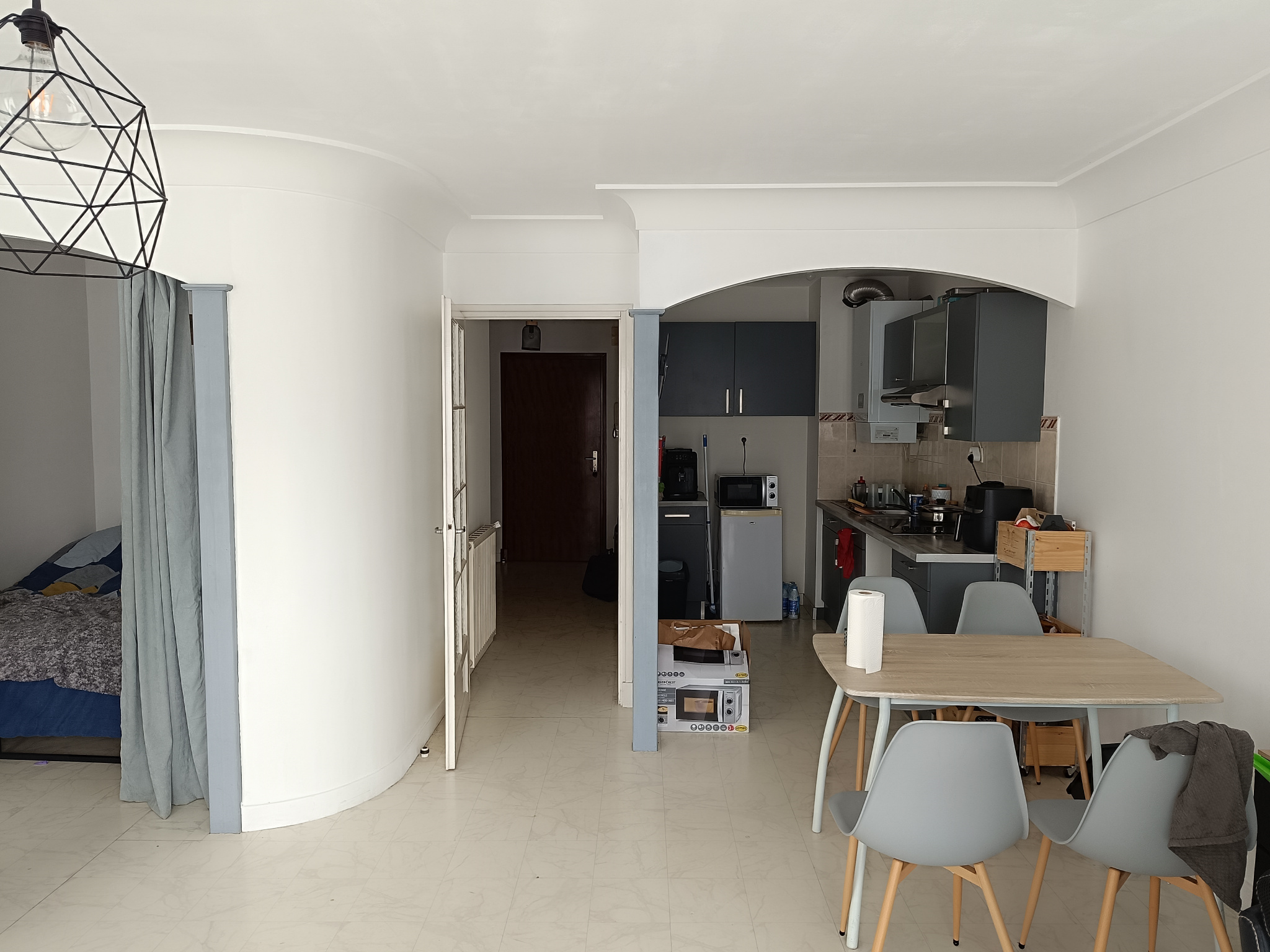 le studio comprend une pièce de vie avec lit 160x190 table chaise télévision meuble de rangement, ouvert sur la cuisine comprenant plaque de cuisson hotte micro-ondes, l...