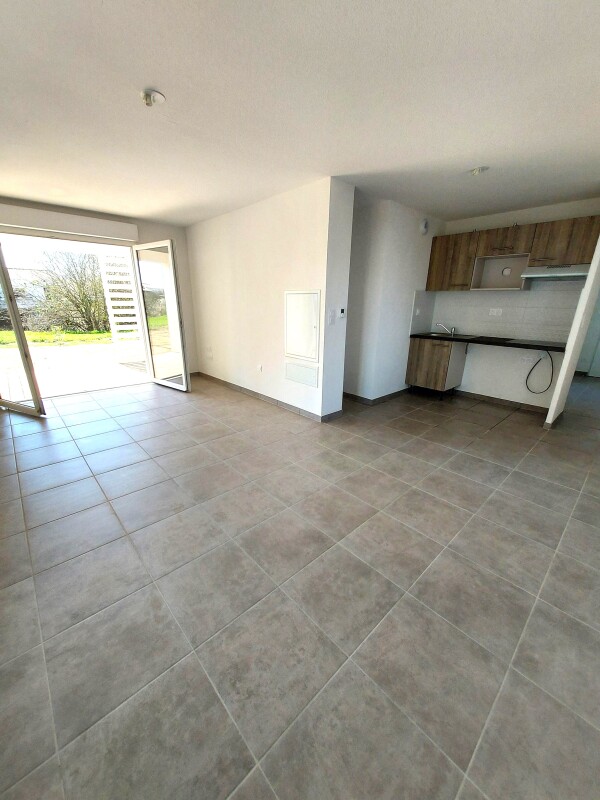 Un appartement T2 comprenant : une entrée avec placard, une cuisine aménagée, un séjour avec balcon, un cellier, une chambre une salle d'eau et un WC.