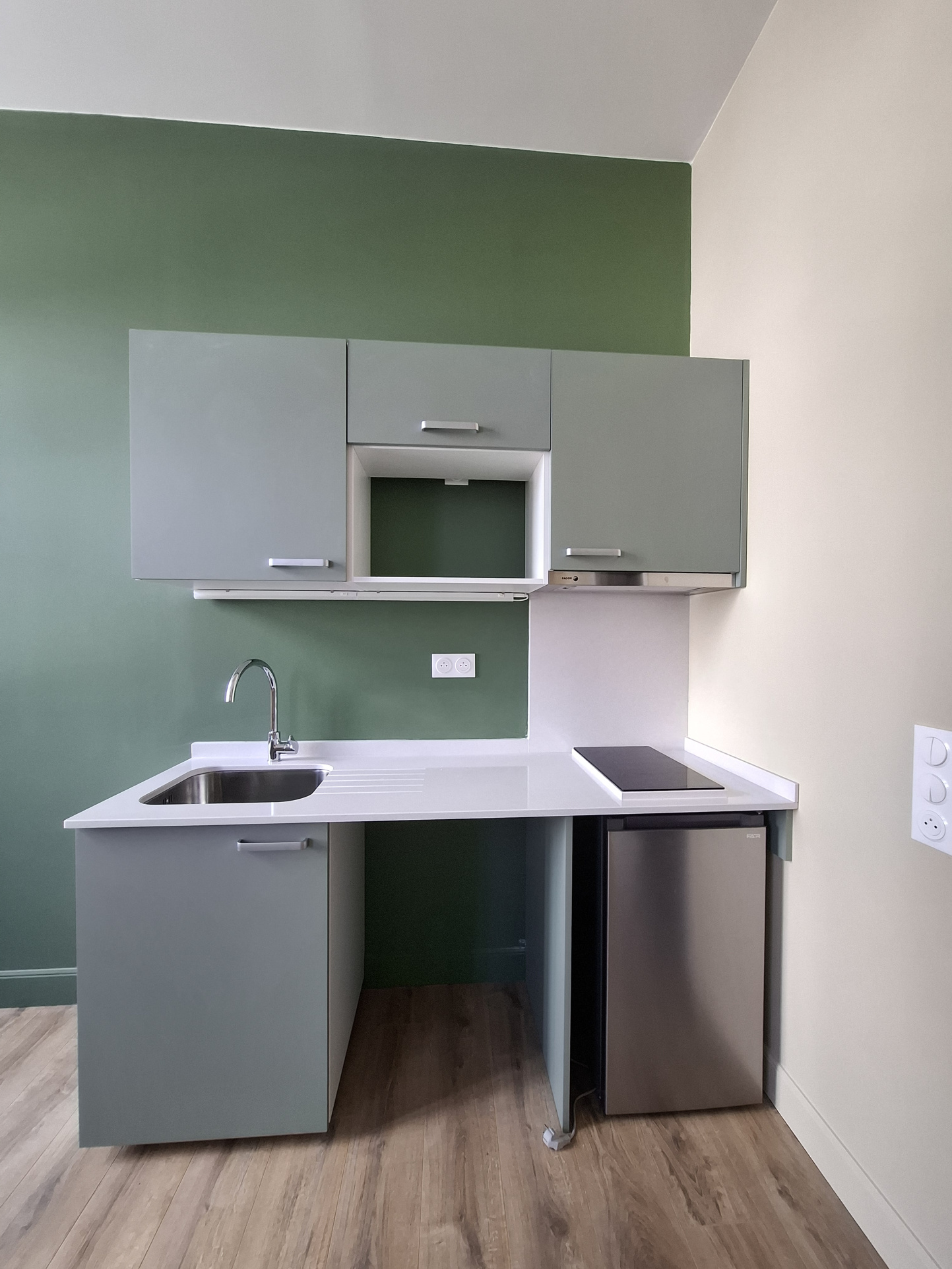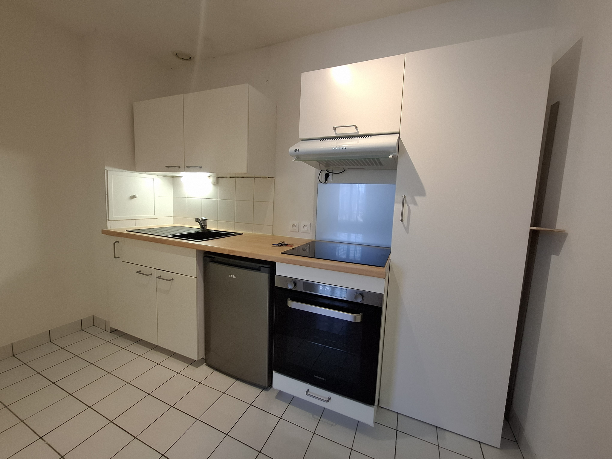 Entrée avec placard, séjour avec cuisine ouverte aménagée (plaques, frigo), chambre avec armoire/penderie, salle d'eau avec wc.