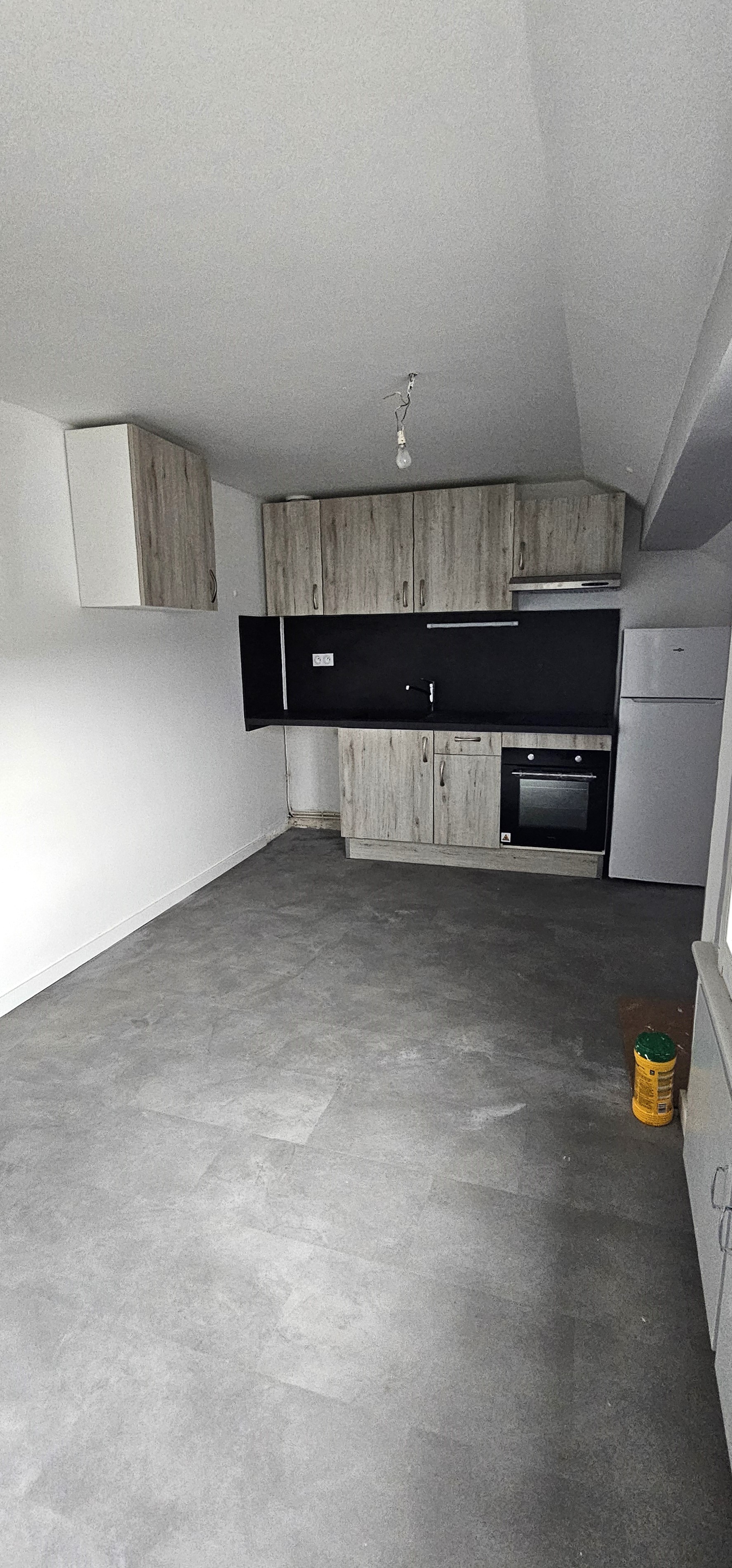 ELOYES Rue des Donjons : Studio situé au 2ème et dernier étage comprenant : entrée, cuisine équipée (plaque de cuisson, hotte, four) ouverte sur pièce principale / chambre, salle de bain (baignoire), wc séparé par une cloison. Chauffage individuel électrique...