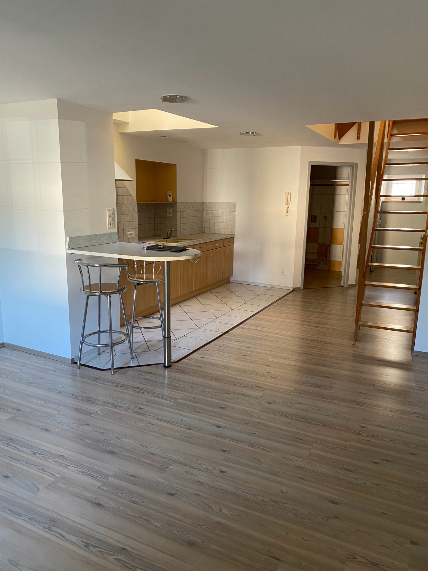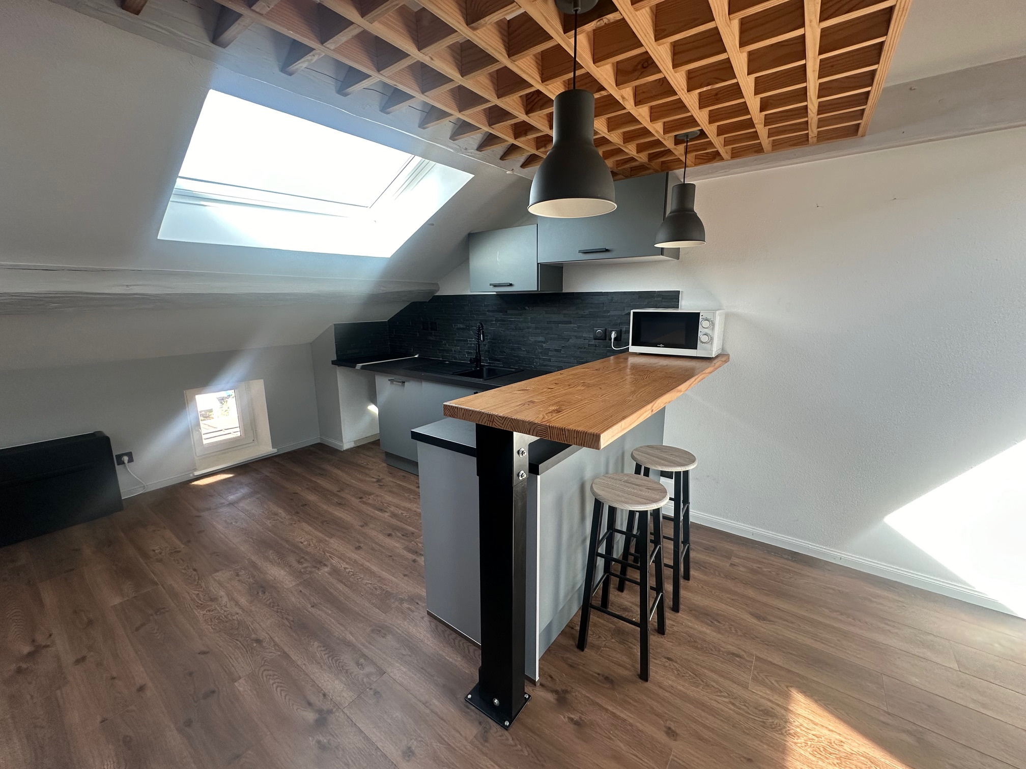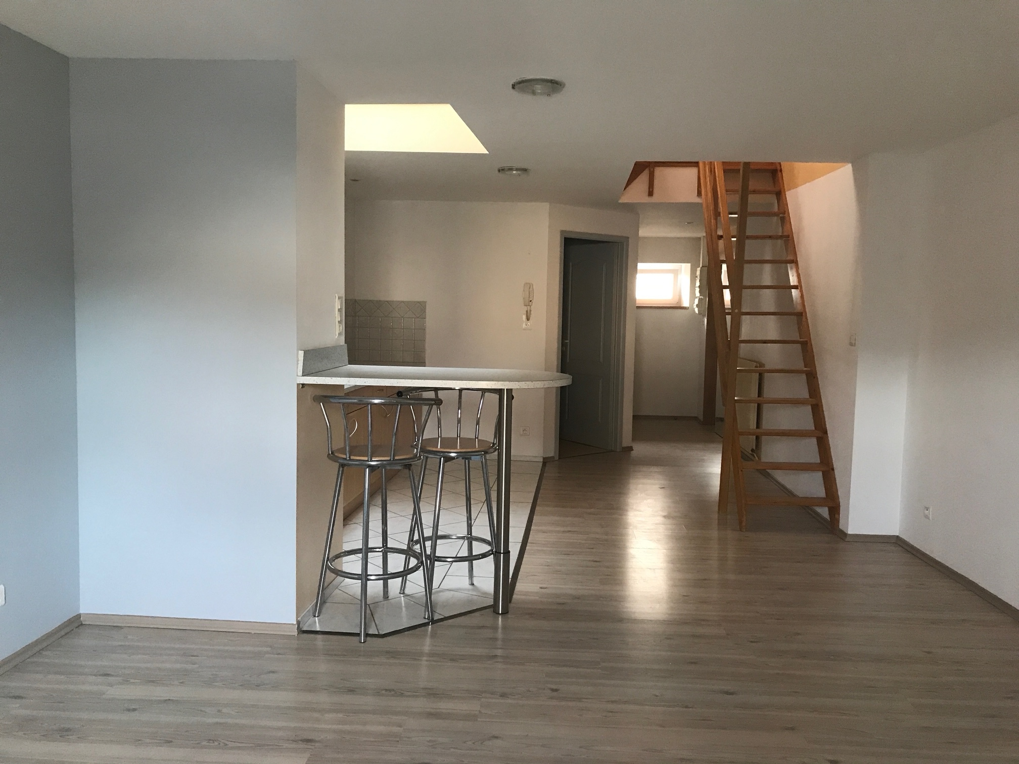 Proche touts commodités, au calme et indépendant, Appartement en duplex type F1 comprenant un séjour/cuisine meublée et en partie équipée, une chambre mansardée et salle de bains/WC à l'étage.