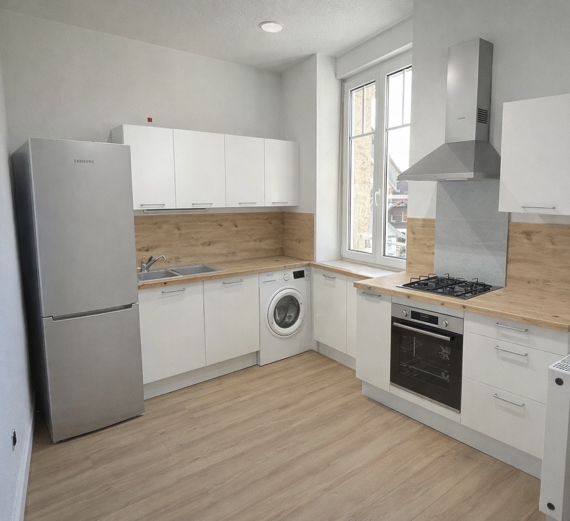 EN EXCLUSIVITE - REMIREMONT - Rue des Brasseries : Appartement F2 situé au 1er étage : entrée sur cuisine (évier + hotte + meuble de rangement), séjour, chambre, salle de douche avec WC. Chauffage individuel au gaz de ville.