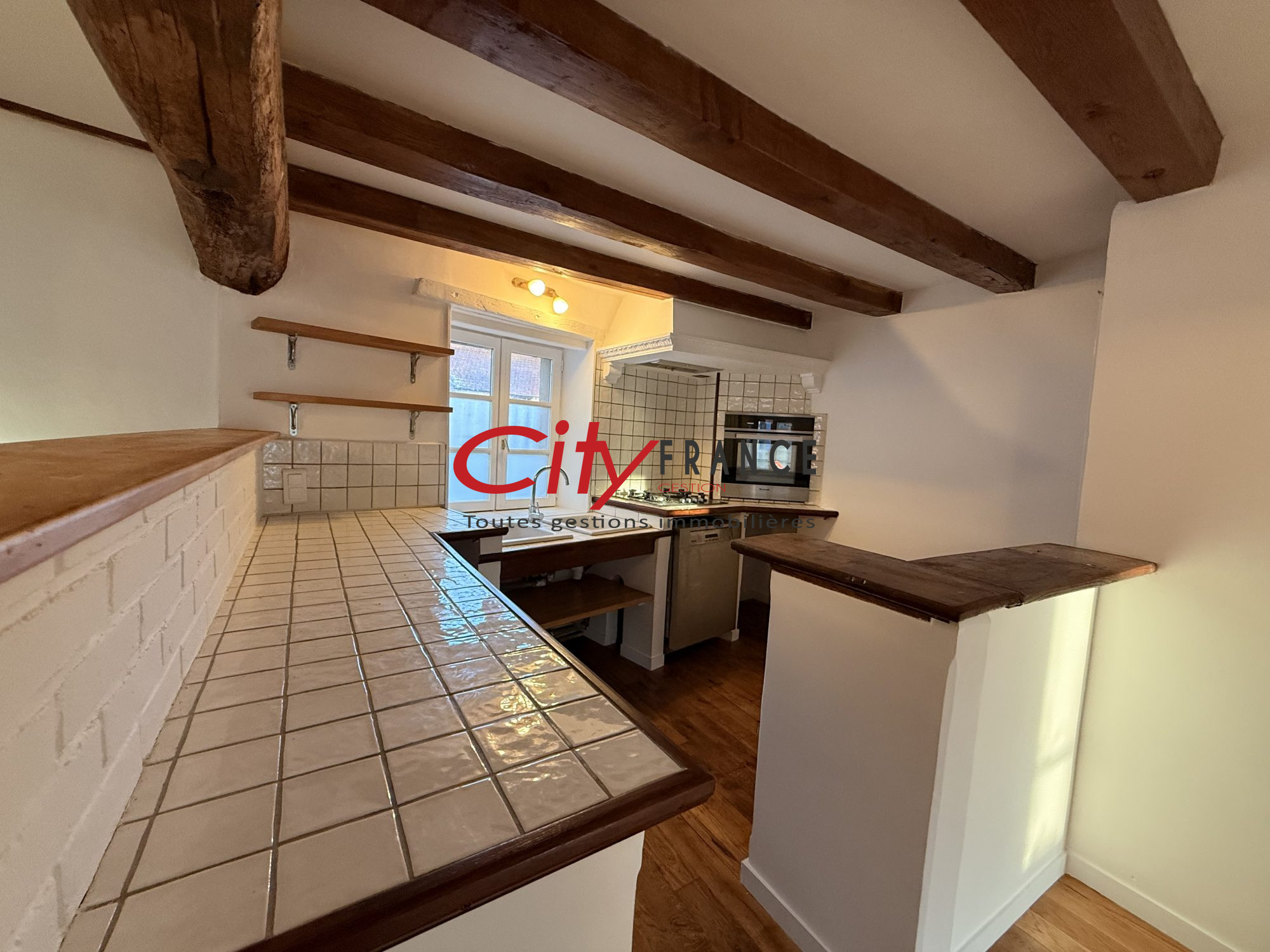 Proche Place du Marché, au dernier étage charmant Duplex de 67,40 m² (82 m² au sol) : Entrée, Séjour avec Cuisine Américaine de 33,5 m², deux belles chambres, Salle de bains + Douche, espace Buanderie, Placards. ...