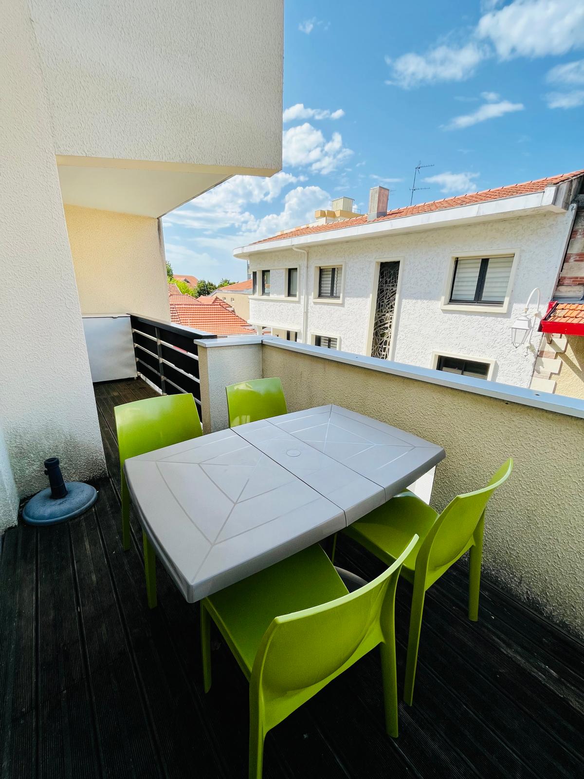 BEGLES Appartement 2 pièces meublé avec un balcon de 5,90 m2 comprenant entrée, séjour ouvert donnant sur un balcon, cuisine ouverte aménagée (plaque de suisson frigo hotte lave linge), chambre, salle de bains, WC. Cellier. Lave linge, Place de parking réserv...