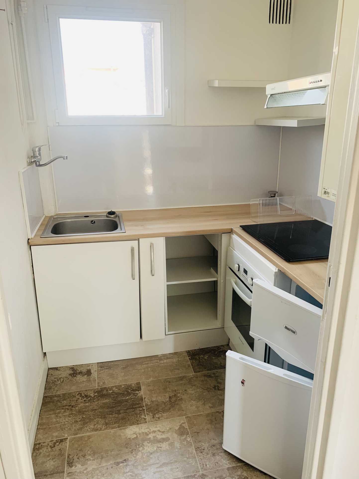 Appartement meublé proche université idéal colocation comprenant: ~Un hall d'entrée, coin cuisine équipée avec réfrigérateur, four, plaques vitrocéramiques, hotte, séjour, deux chambres