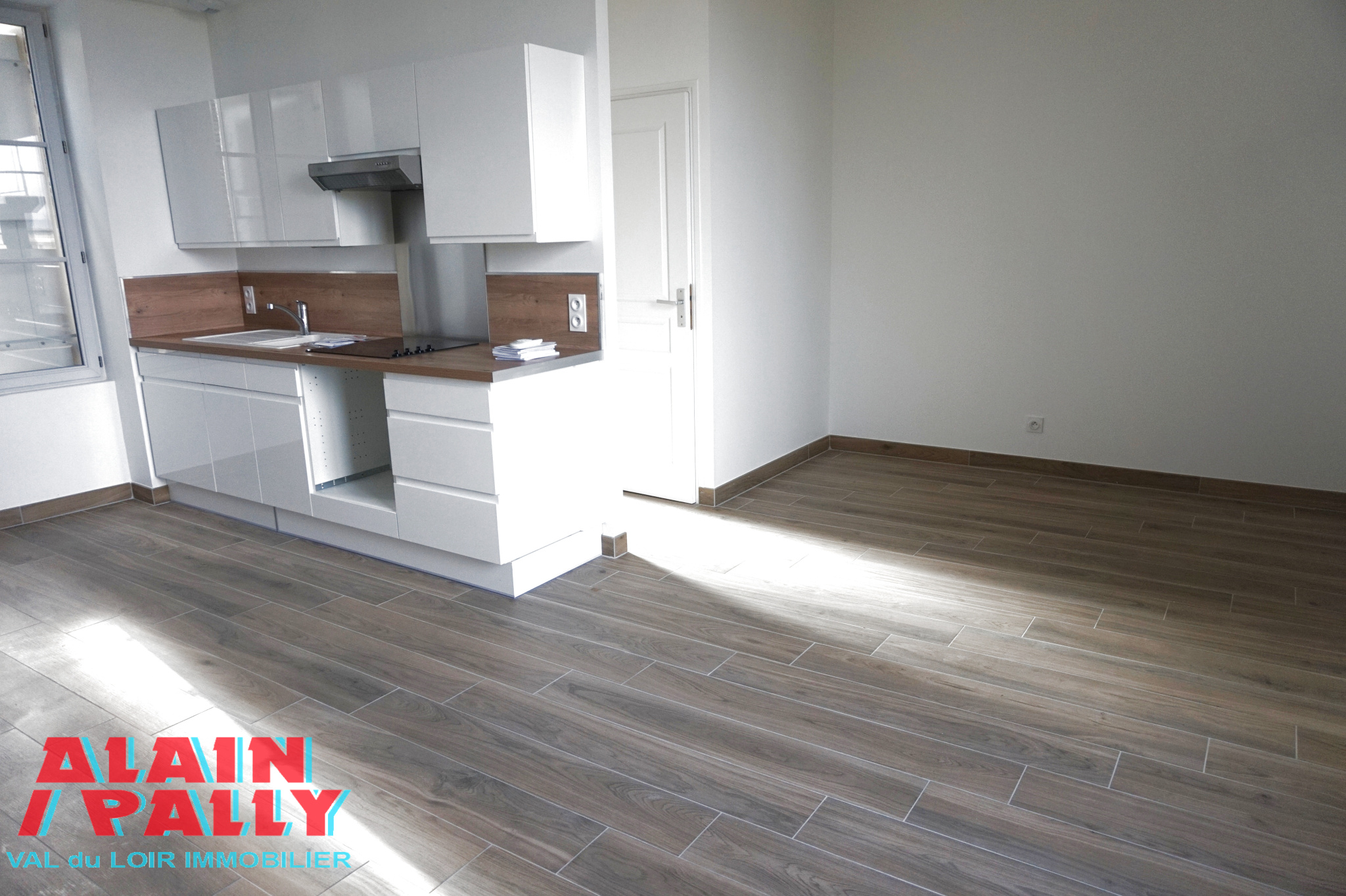 En plein centre ville de Bonneval, un appartement au 1er étage entièrement rénové se composant d'un beau séjour avec kitchenette équipée (réfrigérateur-plaques), une chambre et une salle d'eau - WC.