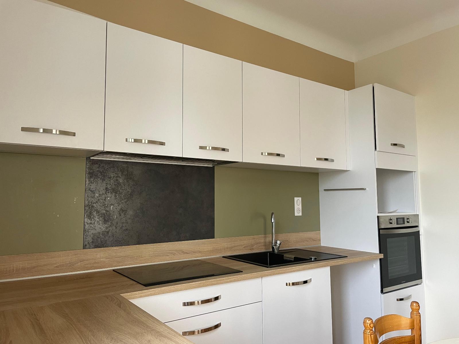 Studio, avec cuisine aménagée et équipée d'une plaque, hotte et frigo, salle d'eau avec douche et toilette.
