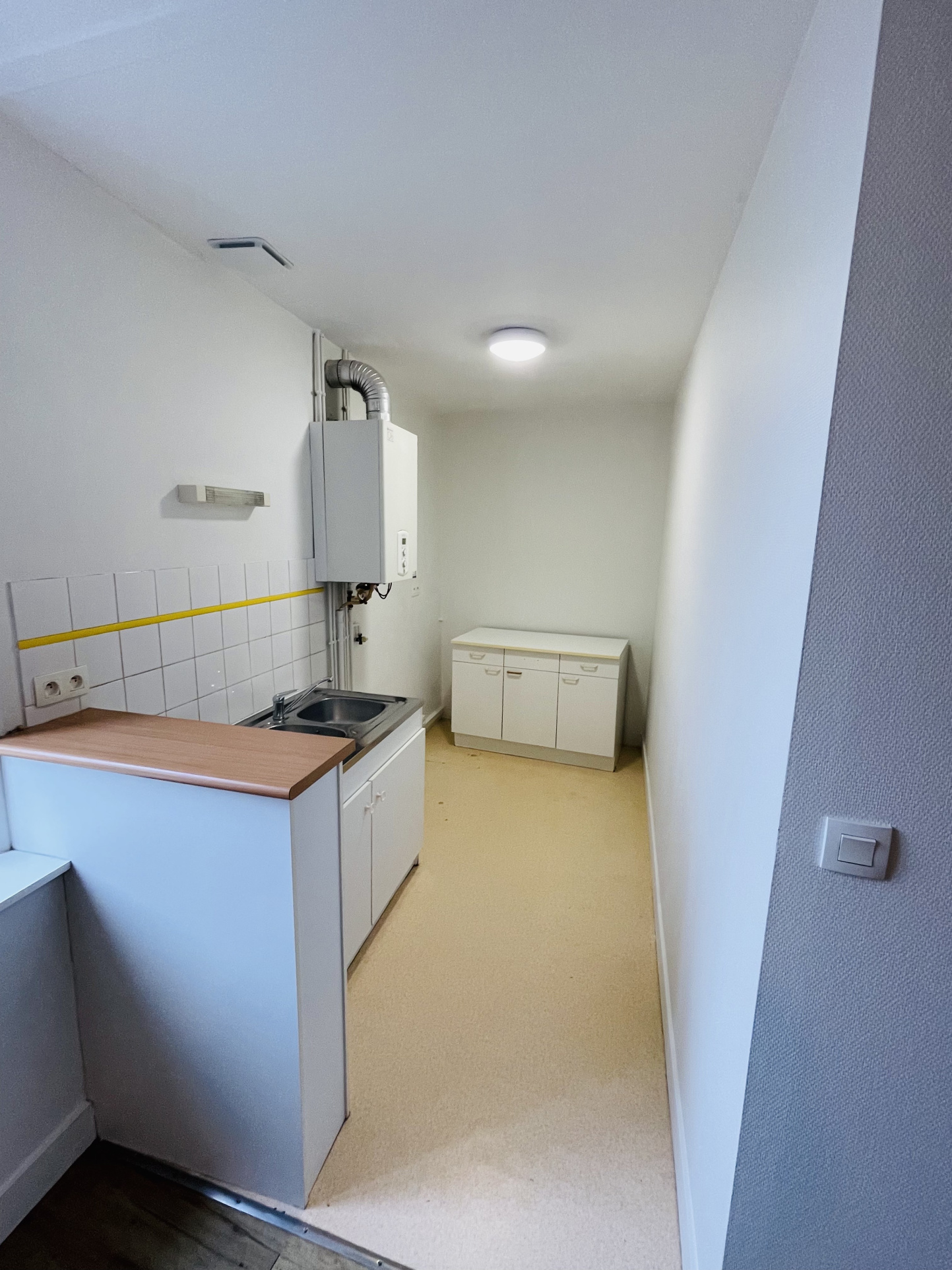 Cet appartement T2 se compose d'une entrée accueillante avec un placard, d'un séjour lumineux, idéal pour vos moments de détente, et d'une cuisine séparée.