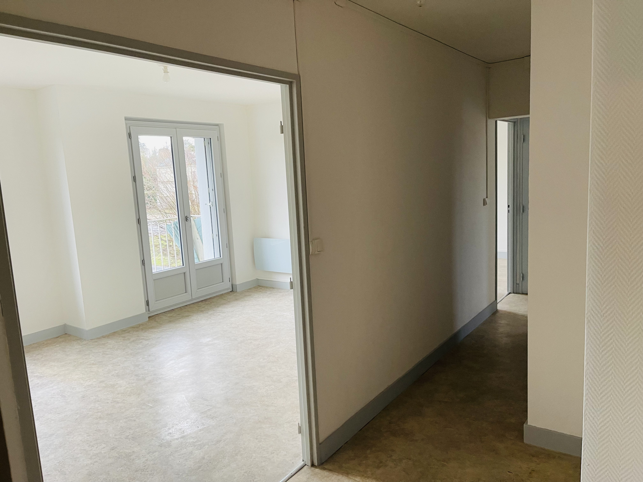 Appartement de Type 3 proche de la Vienne et du centre ville, comprenant : entrée avec placard, séjour avec cuisine américaine, deux chambres, salle d'eau avec WC.
