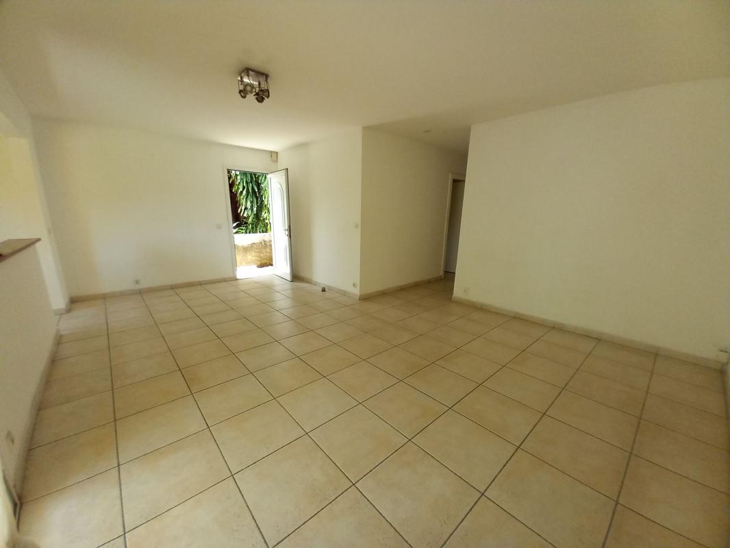 Haut de villa de type T3 non meublé, composé d'un séjour, une cuisine ouverte aménagée et équipée, deux chambres climatisées, une salle d'eau/wc et une salle de bain/wc.