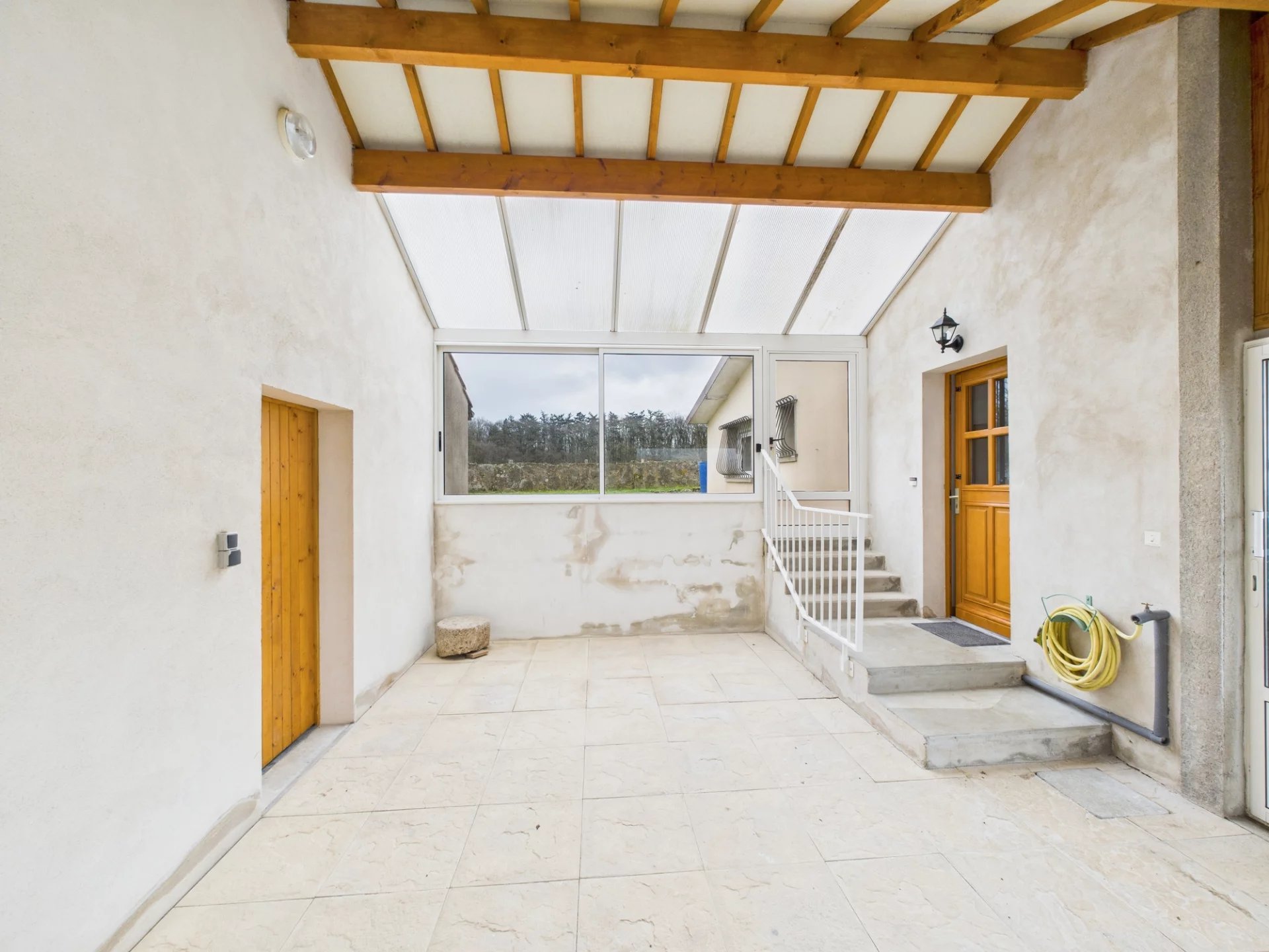 l’appartement se compose d’une entrée sous véranda, une cuisine partiellement aménagée, une pièce de vie, deux chambres un WC, une salle d’eau, une buanderie.