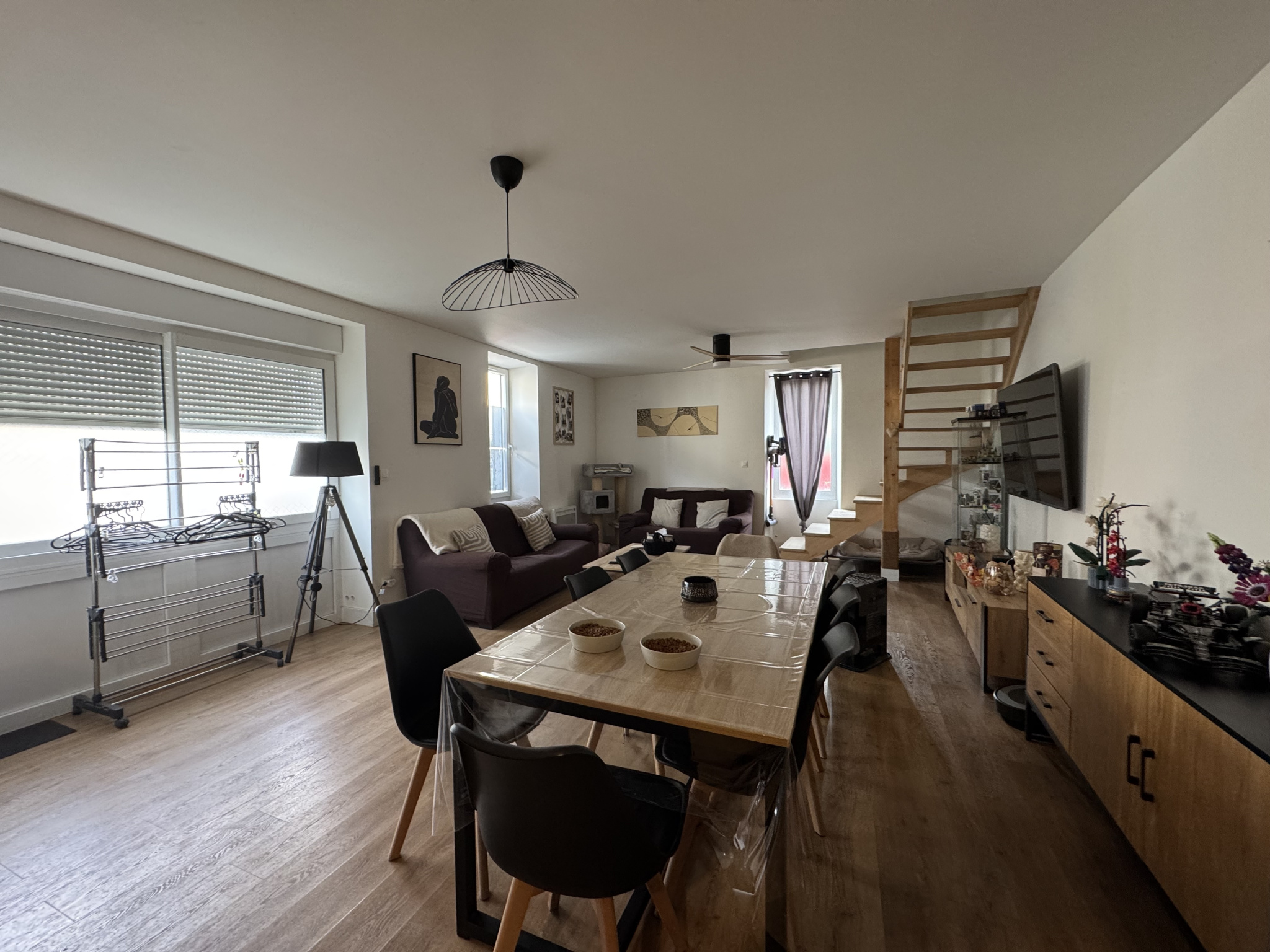 Maison de type T4 d'une superficie de 77 m2 environ comprenant au rdc : une entrée donnant sur une pièce de vie avec coin cuisine ouverte sur le séjour. A l'étage, un palier desservant trois chambres (9 et 10 m2) et une s...