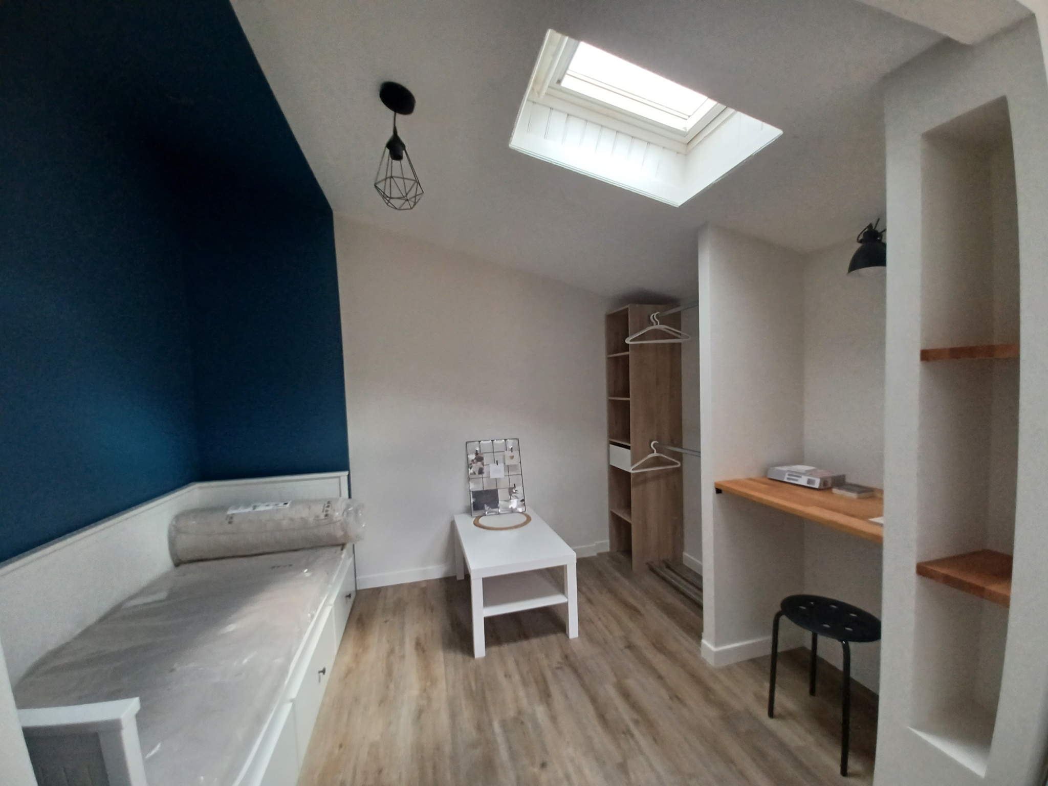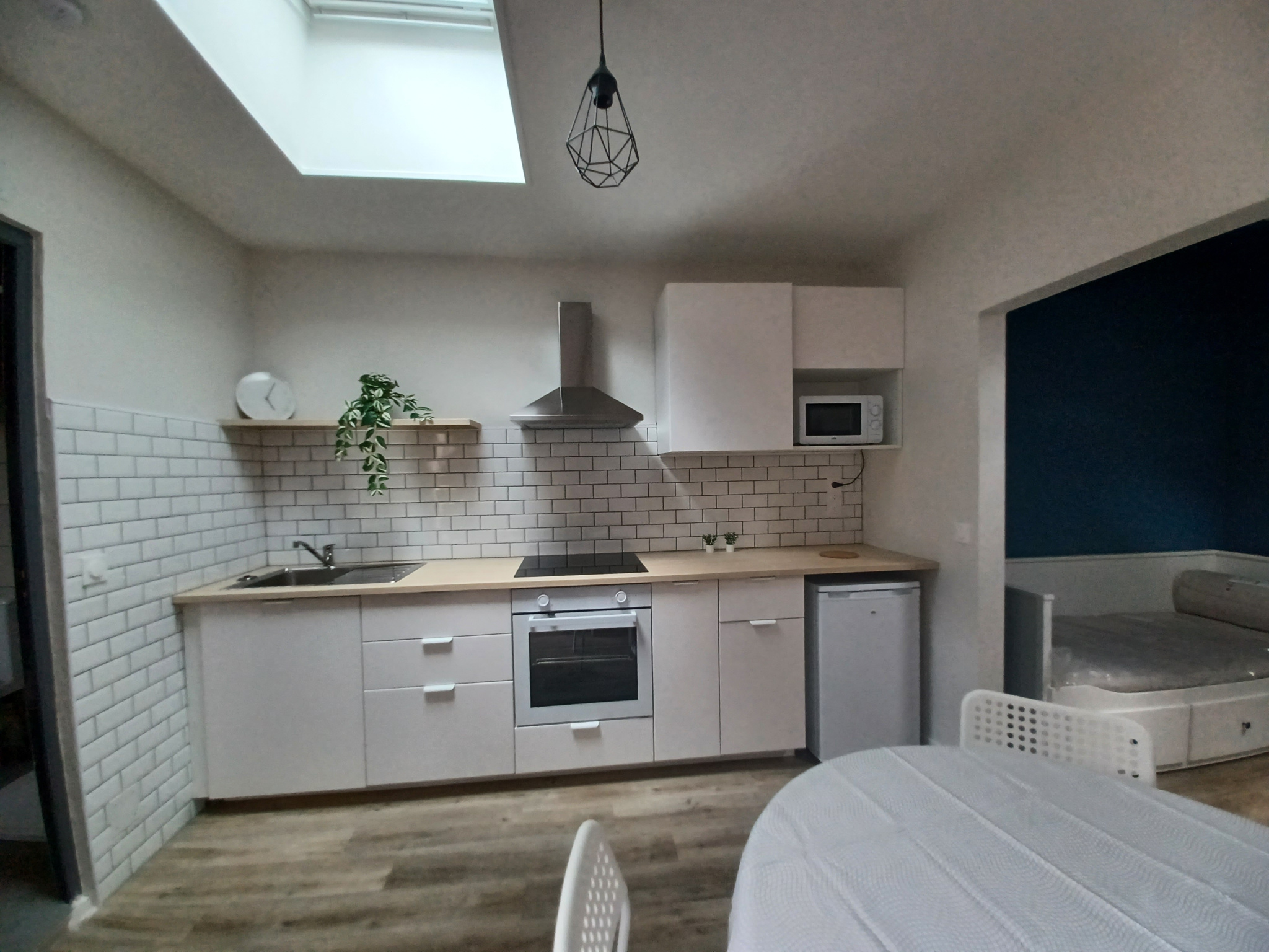 Le logement comprend : un grand salon ouvert sur une cuisine équipée, une salle d'eau avec wc et une petite pièce pouvant faire office de chambre.