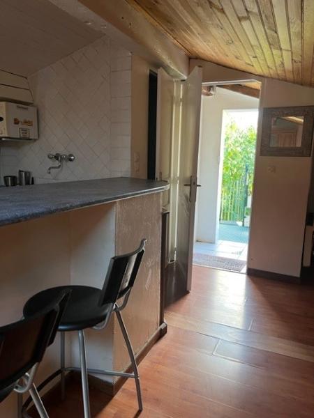 Cuisine aménagée et semi -équipée (plaque et hotte), séjour avec placards, une salle d'eau avec wc.