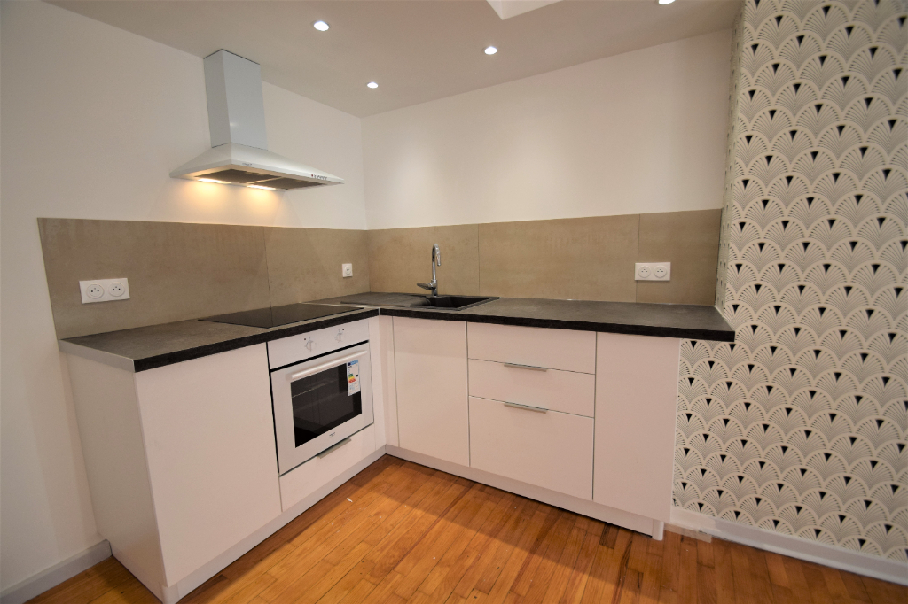 Appartement de type F1 bis dans petit immeuble bien entretenu et entièrement rénové composé d'une cuisine ouverte aménagée et équipée (éléments meublants, hotte, plaque de cuisson, four), d'un séjour, d'une chambre avec...