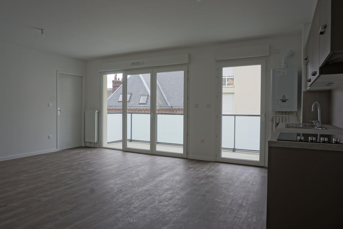 ROUEN - rue du 74ème Régiment d'Infanterie. Dans un immeuble très récent, au deuxième étage avec ascenseur un appartement offrant un beau séjour avec une cuisine ouverte aménagée. Balcon sud. Deux chambres. Salle de douche. WC indépendant.
