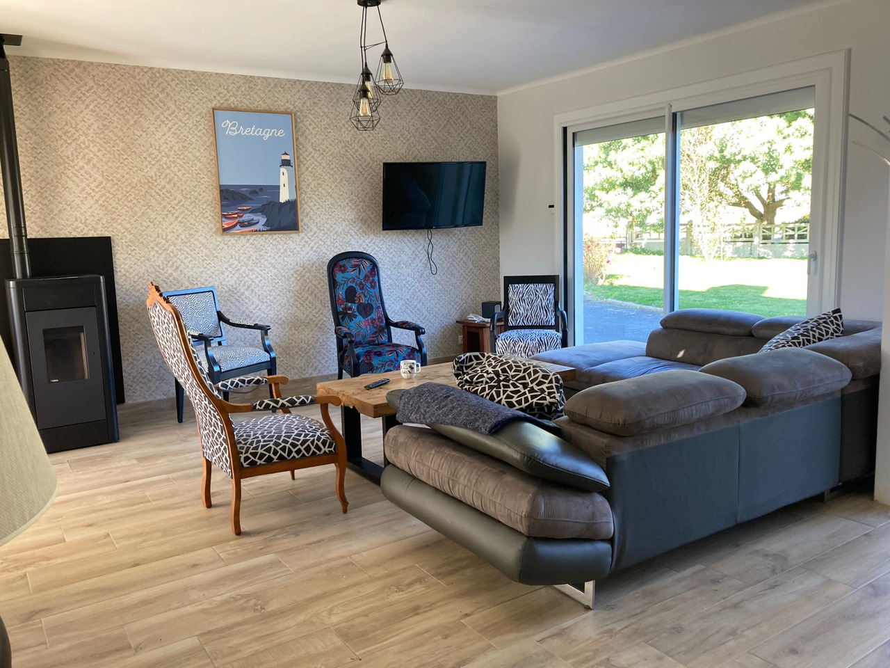 PLÉRIN PROCHE PORT DU LÉGUÉ, Très belle maison contemporaine de 7 pièces meublée sur un terrain clos et arboré de 1 120 m² avec PISCINE CHAUFFÉE, comprenant :