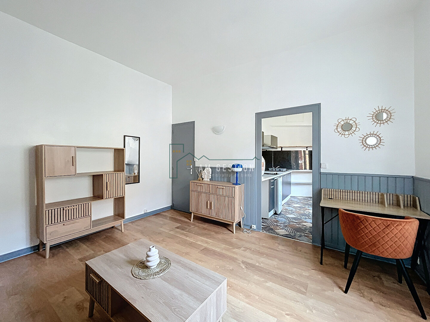 - 1 salon/séjour avec cuisine ouverte équipée et aménagée