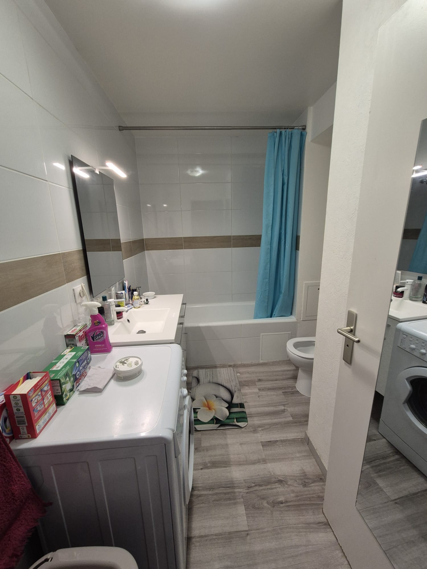 Appartement de 2 pièces composé d'une entrée avec placard, une salle de bains, un WC séparé, une chambre avec placard, un séjour très lumineux et une cuisine séparée et équipée;