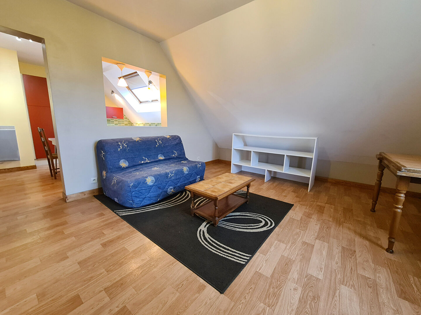 Cuisine aménagée et équipée (gazinière, frigo) ouverte sur pièce de vie, chambre avec placard, salle d'eau avec WC.