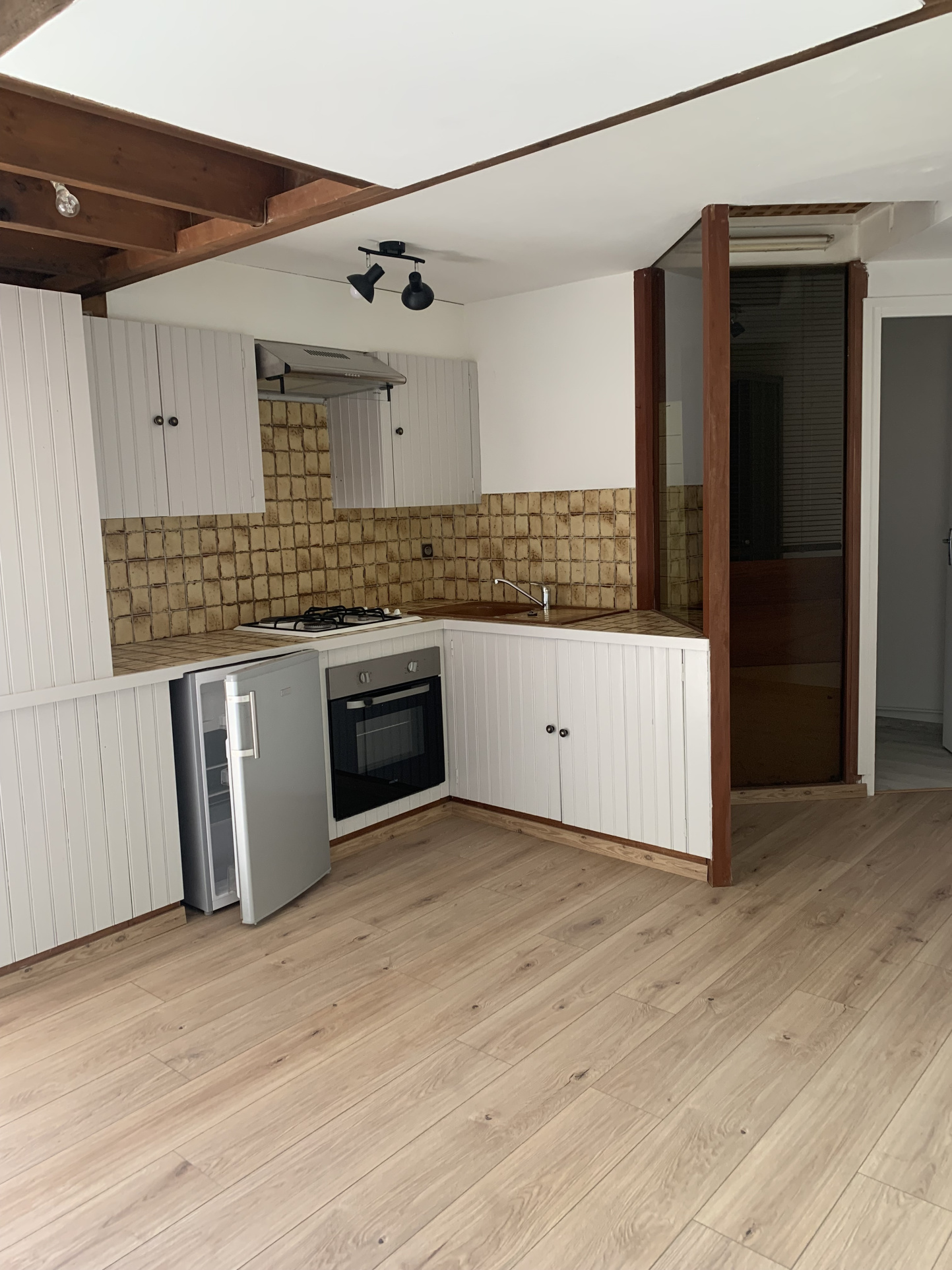 Studio de 16.32 m2 situé au 1er étage d'un petit immeuble de 3 logements comprenant entrée sur pièce de vie, coin kitchenette (plaques, réfrigérateur), salle d'eau/wc.
