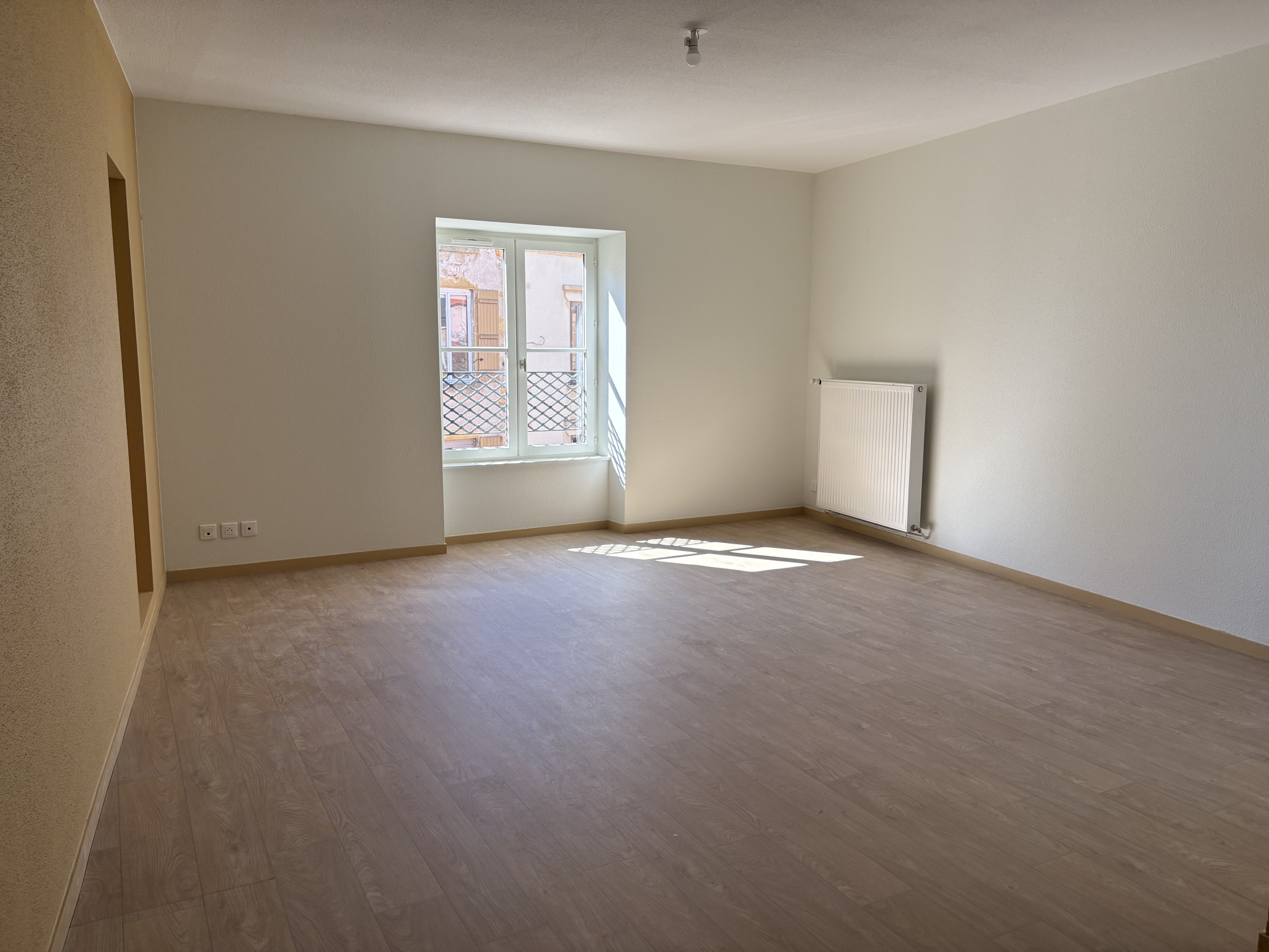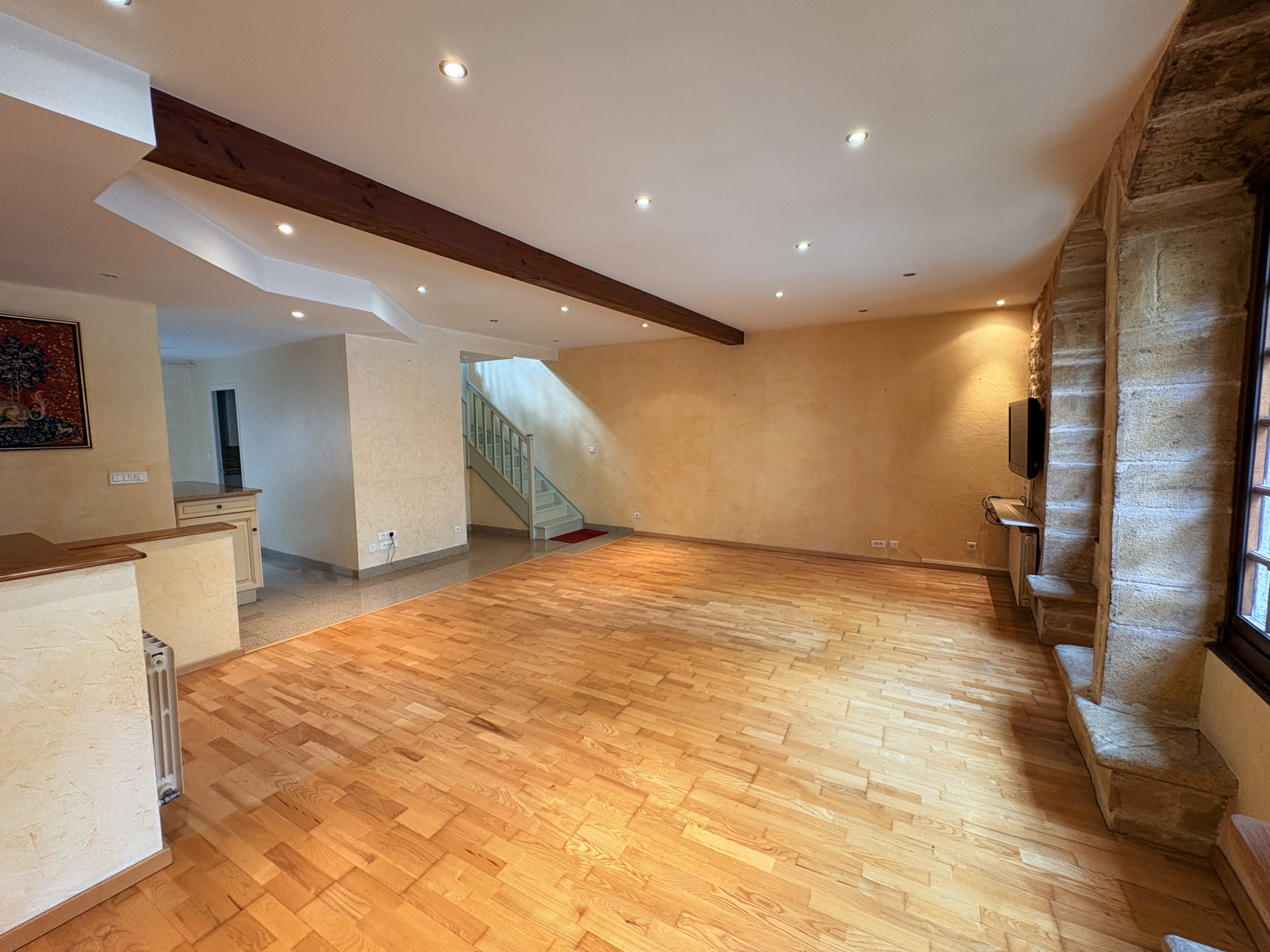 CHARLIEU Rue Grenette - Bel appartement entièrement rénové de type 4 d'une surface habitable de 104 m2 composé d'une vaste pièce de vie avec cuisine équipée (four, plaque, hotte, frigo), un dégagement avec placard, 3 chambres, une salle de bains et W...