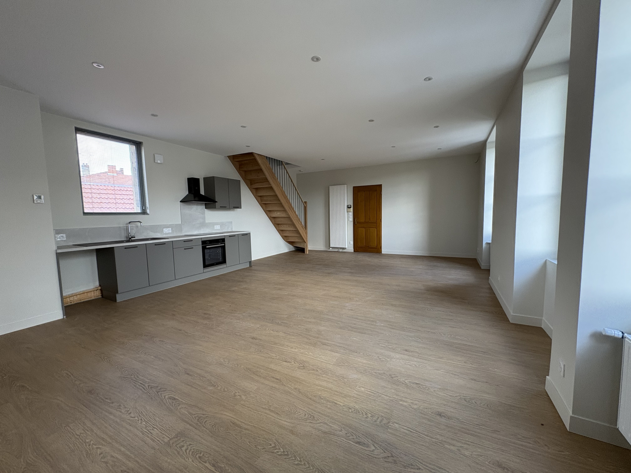 CHARLIEU Boulevard Eugénie Guinault - Charmant duplex entièrement rénové de type 3 d'une surface habitable de 72,76 m2 offrant une vaste pièce de vie lumineuse de 42 m2 avec cuisine équipée (hotte, plaque de cuisson, four). A l'étage, un déganement o...