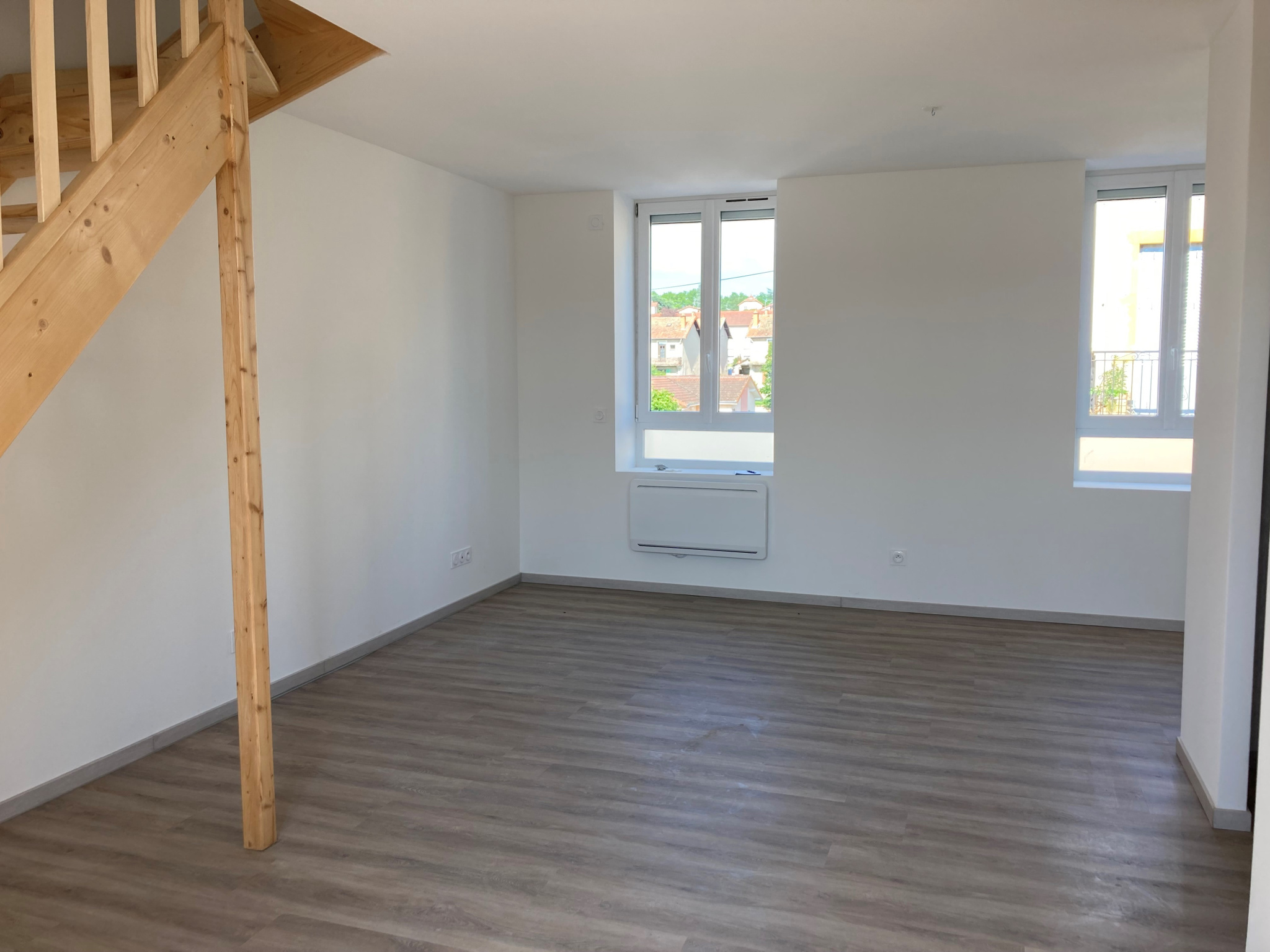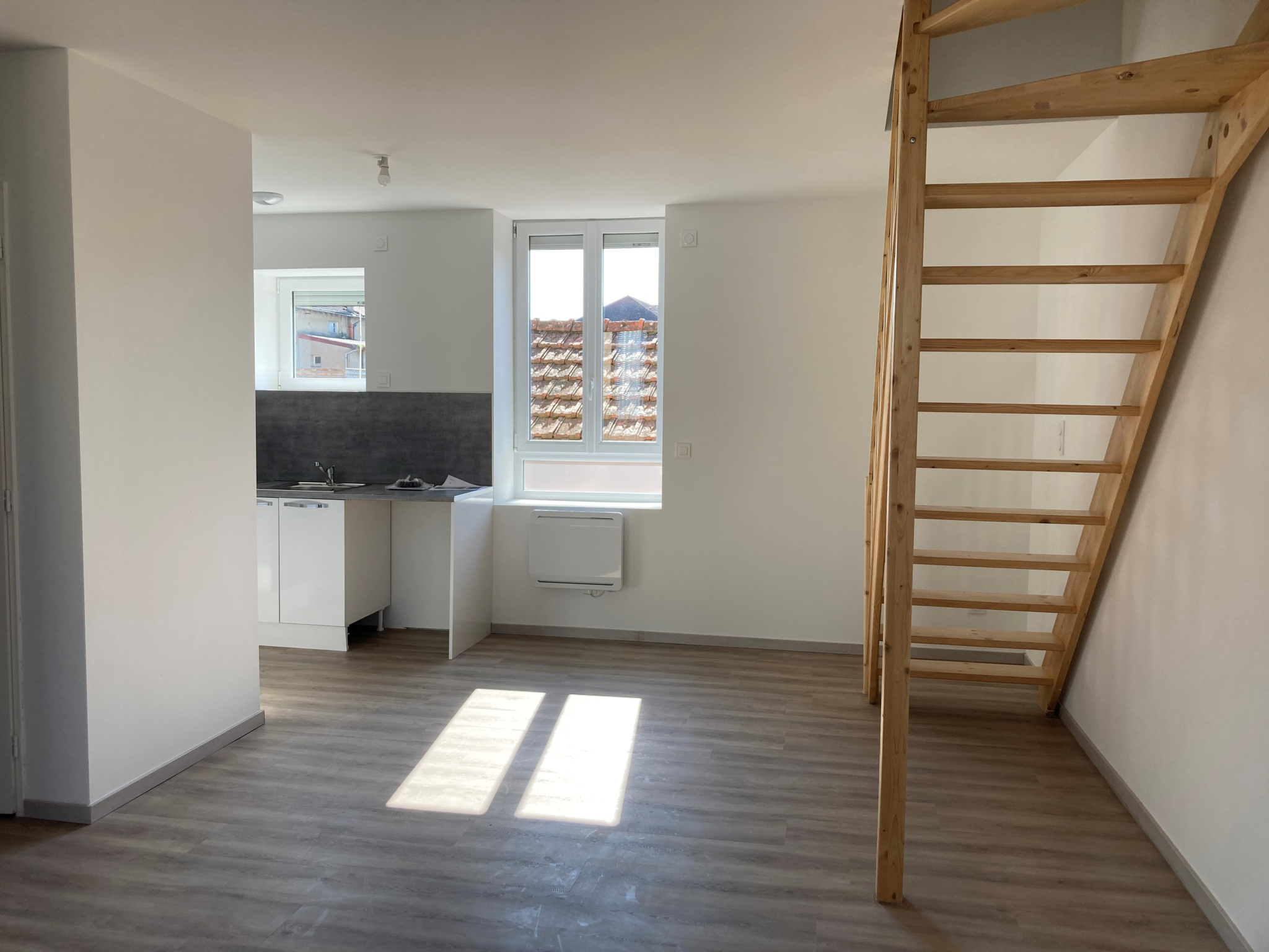 Pouilly sous Charlieu, rue de Marcigny appartement en duplex de type 4 au 1er étage, comprenant au RDC une cuisine équipée (plaque, hotte) ouvrant sur le séjour, un wc, à l'étage 3 chambres, une salle d'eau avec WC. à l'extérieur une place de st...