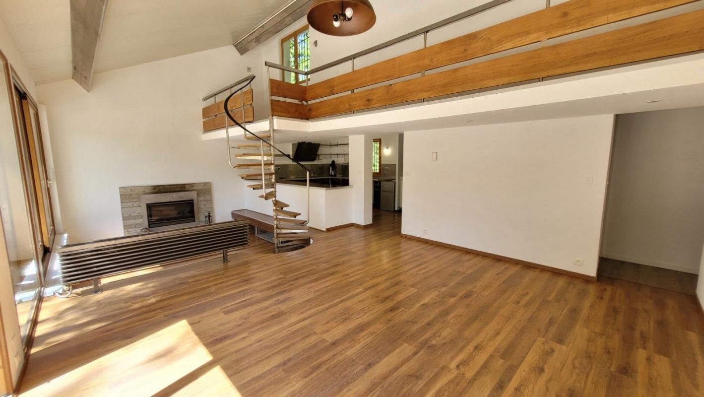 Entrée, belle espace de vie d'environ 36m² en cathédrale avec cheminée et cuisine ouverte 16,4m² aménagée et équipée, dégagement, c...